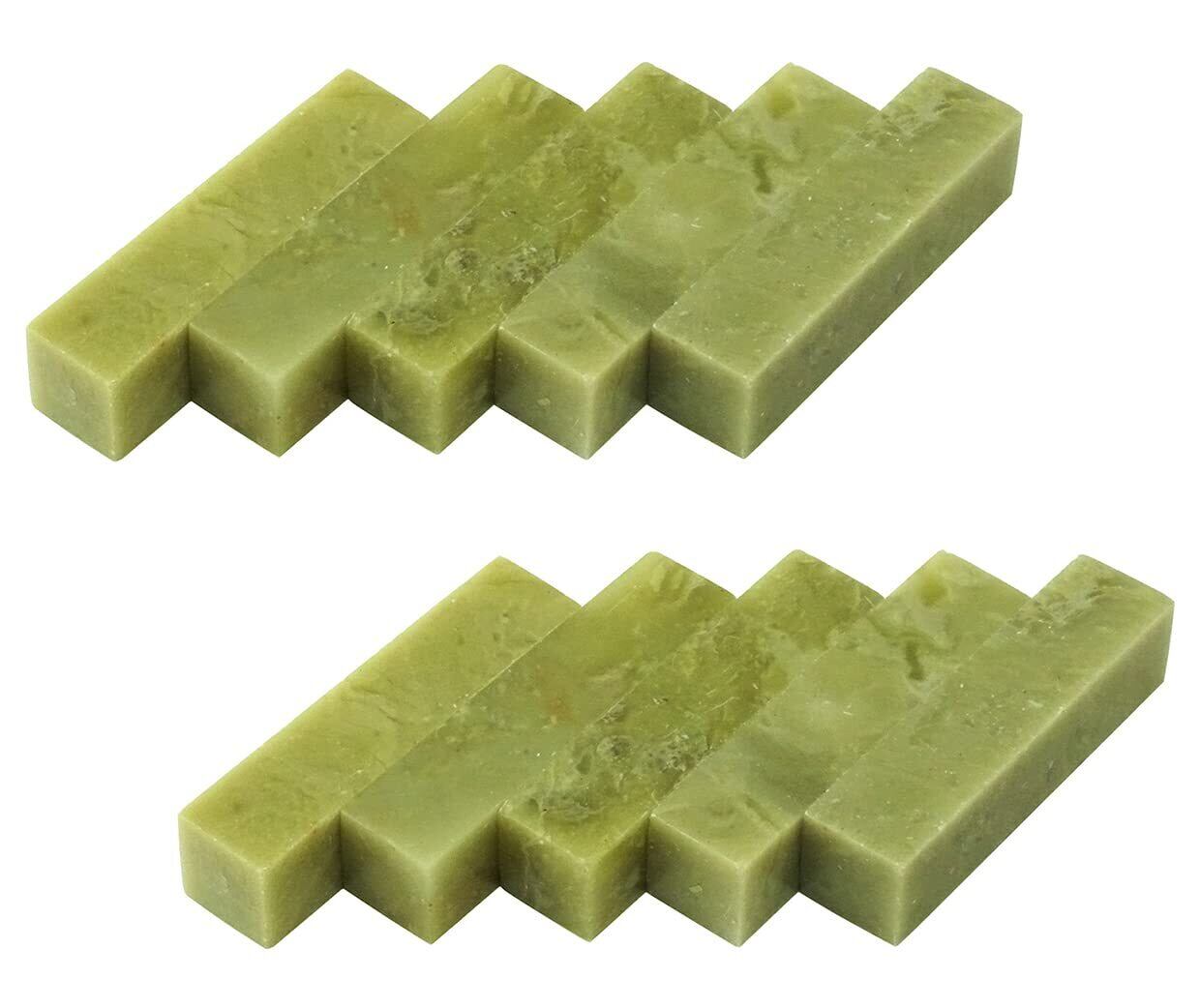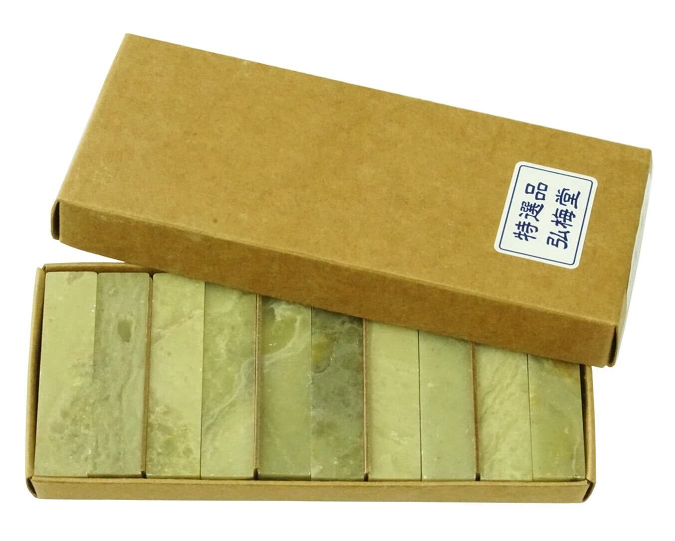 【印材サイズ 約12×12×50mm 10個セット】書道や水墨画、絵手紙作品の雅号印制作に最適な篆刻初心者でも彫りやすい印材です。彫る前に印面を耐水ペーパーで滑らかにしてお使いください。薄緑色の印材で、印材としての歴史も古く、現在も広く使われています。青田石は、「ひび割れ」が発生しております。また、天然の石印材ですので、石質には個体差があります。印刀が入りにくい硬い粒状のものが混入している場合もあります。予めご了承をお願い致します。また、キズ、欠け、歪み等がある場合があります。その際は紙やすり(耐水ペーパー)を利用して修正のうえお使いください。