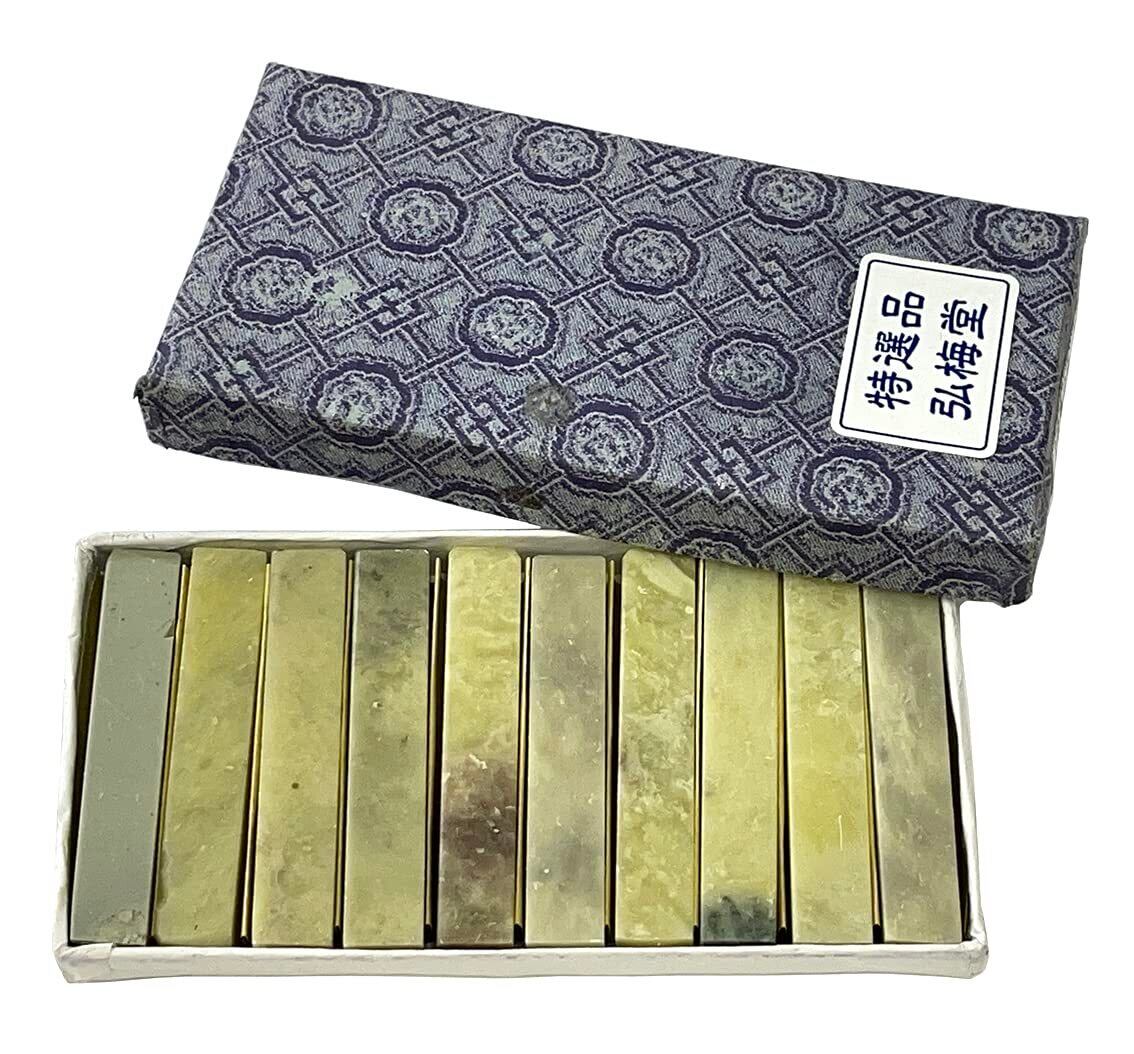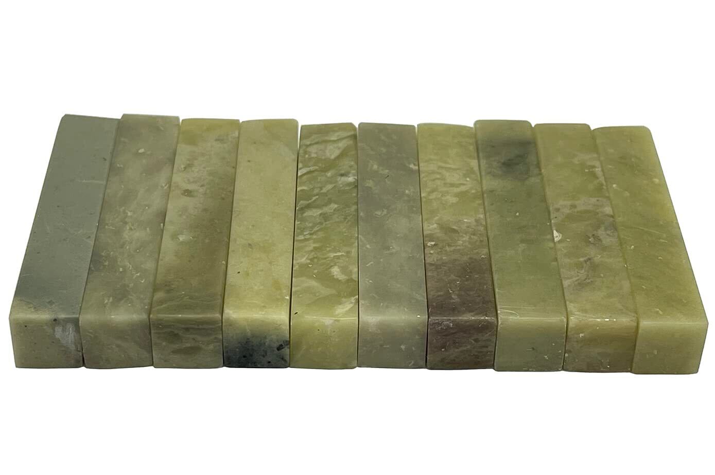 【印材サイズ 約9×9×50mm 10個セット】書道や水墨画、絵手紙作品の雅号印制作に最適な篆刻初心者でも彫りやすい印材です。彫る前に印面を耐水ペーパーで滑らかにしてお使いください。薄緑色の印材で、印材としての歴史も古く、現在も広く使われています。青田石は、「ひび割れ」が発生しております。また、天然の石印材ですので、石質には個体差があります。印刀が入りにくい硬い粒状のものが混入している場合もあります。予めご了承をお願い致します。また、キズ、欠け、歪み等がある場合があります。その際は紙やすり(耐水ペーパー)を利用して修正のうえお使いください。