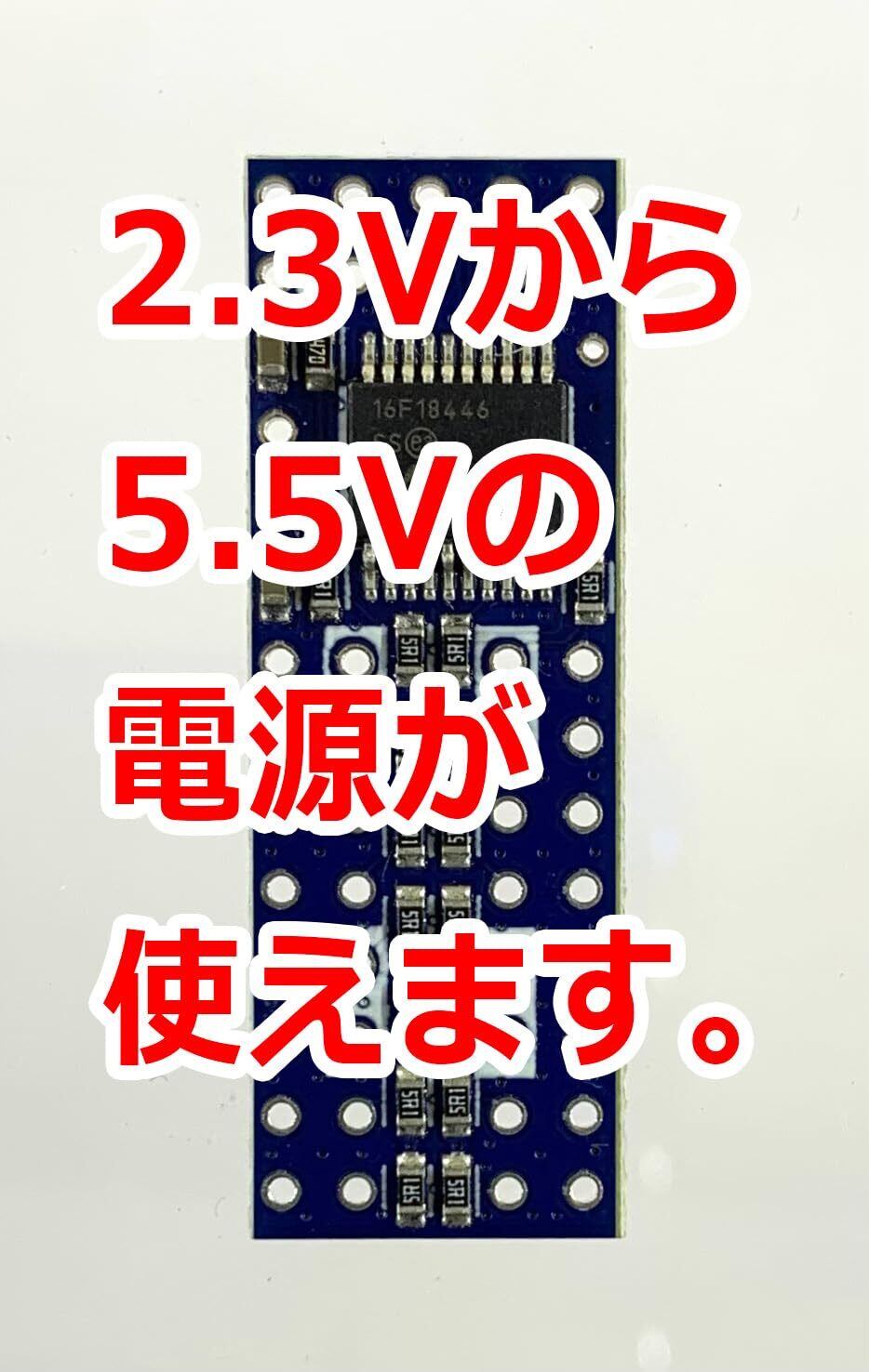 電源は2.3V〜5.5Vの範囲で使用可能です。例えば3Vのボタン電池や、1.5Vの乾電池2本を直列にして3V、3本直列にして4.5V、USB電源で5Vなど多彩な電源が使用可能です。