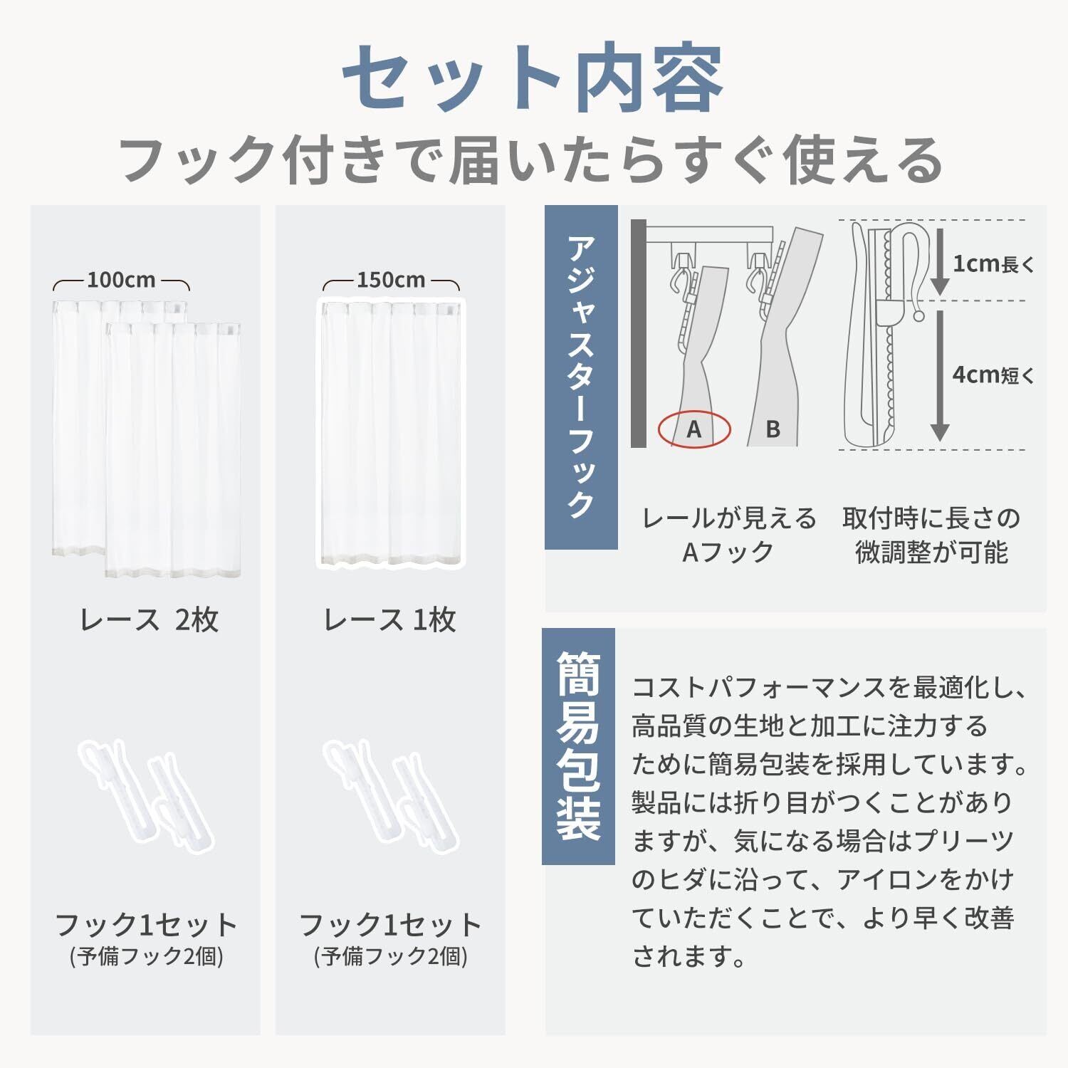 【商品仕様】※組成:ポリエステル100%。※機能:ミラー効果/UVカット/ウォッシャブル。※縫製:1.5倍ヒダ/ 2ッ山を採用し、出来上がり幅に対して使う生地の幅を1.5倍としっかり使うことで機能性がアップします。※セットで届く:ミラーレースカーテンにアジャスターフックがついているので届いてすぐお使いいただけます。※弊社ではコストパフォーマンスを最適化し、高品質の生地と加工に注力するために簡易包装を採用しています。