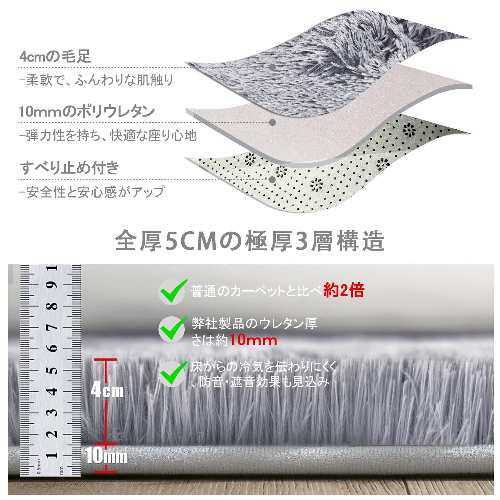 【厚手版仕様】サイズ:120x160cm 、重量1.1KG。①毛足の長さ:約40mm ②ポリウレタンの厚さ:約10mm ③裏地:不織布(滑り止め付き) 。弾性が抜群、防音効果が優れます。
