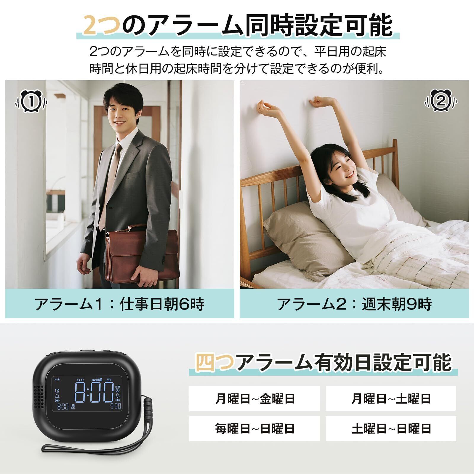 [2つのアラーム同時設定可能]2つのアラームを同時に設定できるので、平日用の起床時間と休日用の起床時間を分けて設定できるのが便利です。アラーム日は、月曜日~金曜日/月曜日~土曜日/月曜日~日曜日/土曜日~日曜日と四つパターンの設定ができます。