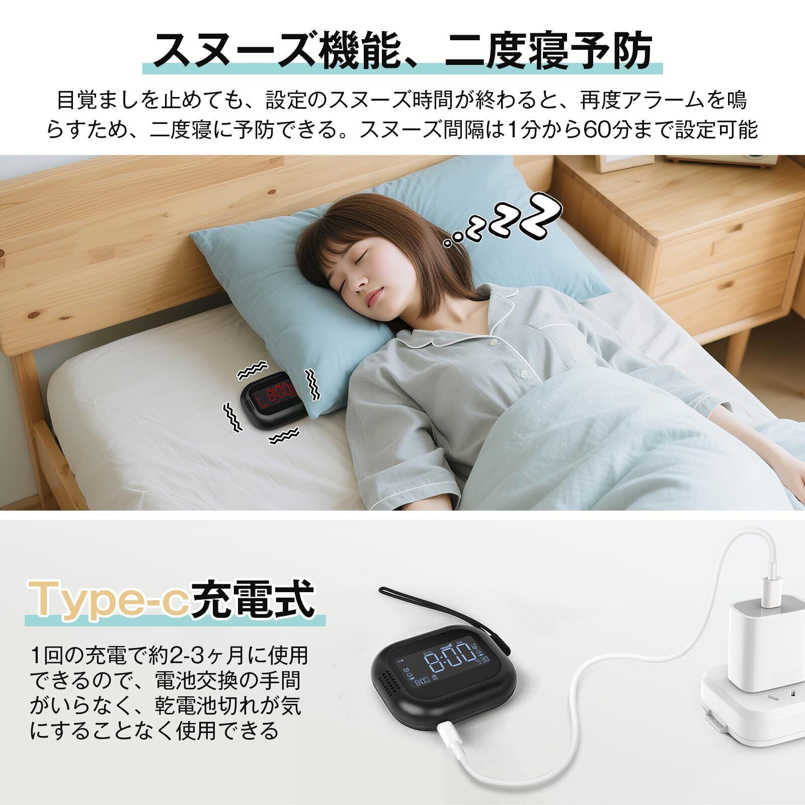 [スヌーズ機能、二度寝予防]目覚ましはスヌーズ機能が付きます。目覚ましを止めても、設定のスヌーズ時間が終わると、再度アラームを鳴らすため、二度寝に予防できます。スヌーズ間隔は1分から60分まで設定できます。早起きが苦手な人にオススメ。(※ご注意:振動効果ために、目覚まし時計を枕の下に挟むんで使用してください)
