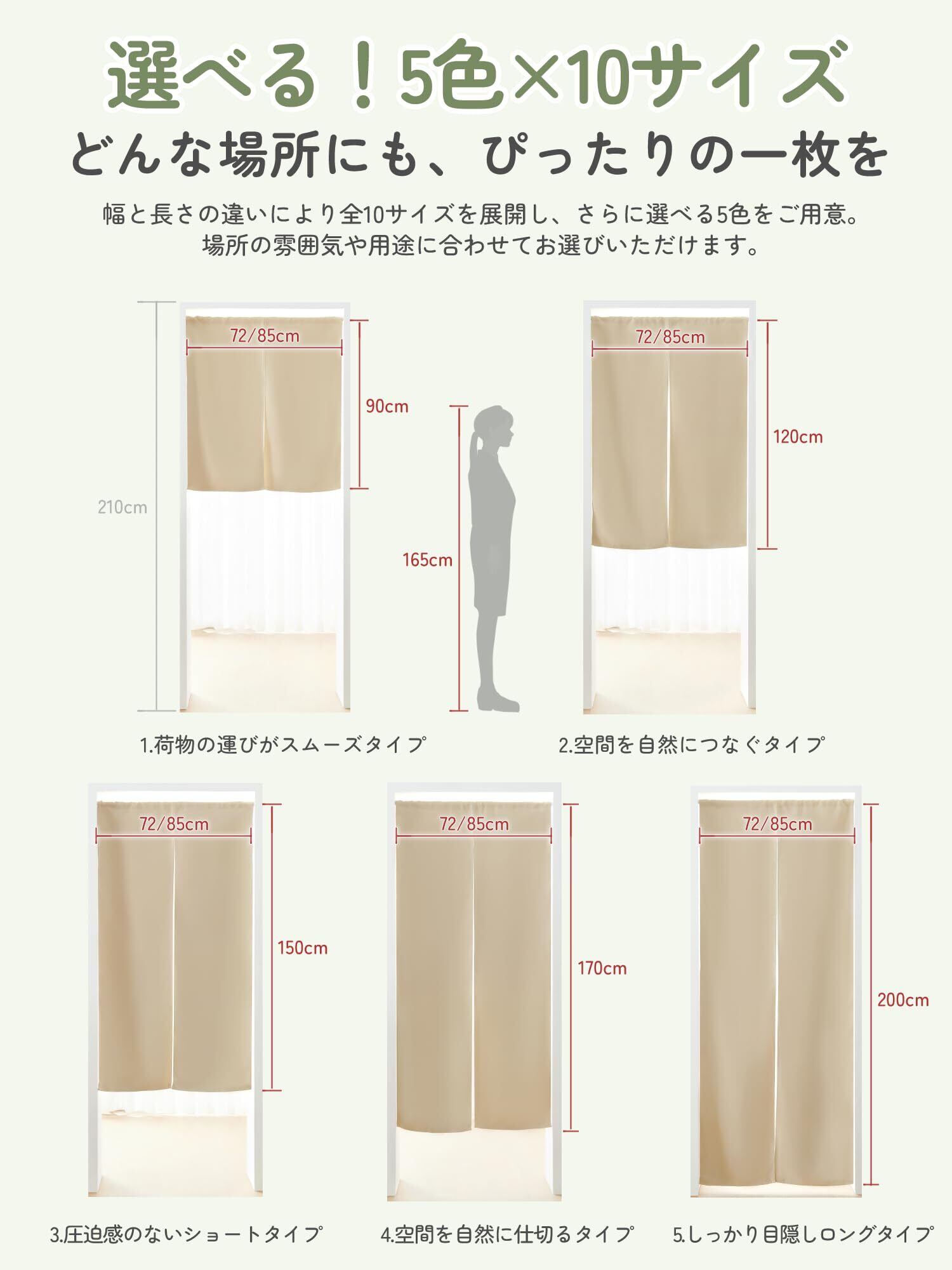 クモリ(Kumori) 遮光 のれん 遮光度99.99% 間仕切りカーテン 暖簾 断熱 無地 厚手 保温 防寒 防音 省エネ 洗濯可能 目隠し ドアカーテン 玄関 キッチン リビング 出入り口 障子 和風 飲食店 ロング (幅72cm×丈170cm・1枚組 ベージュ)