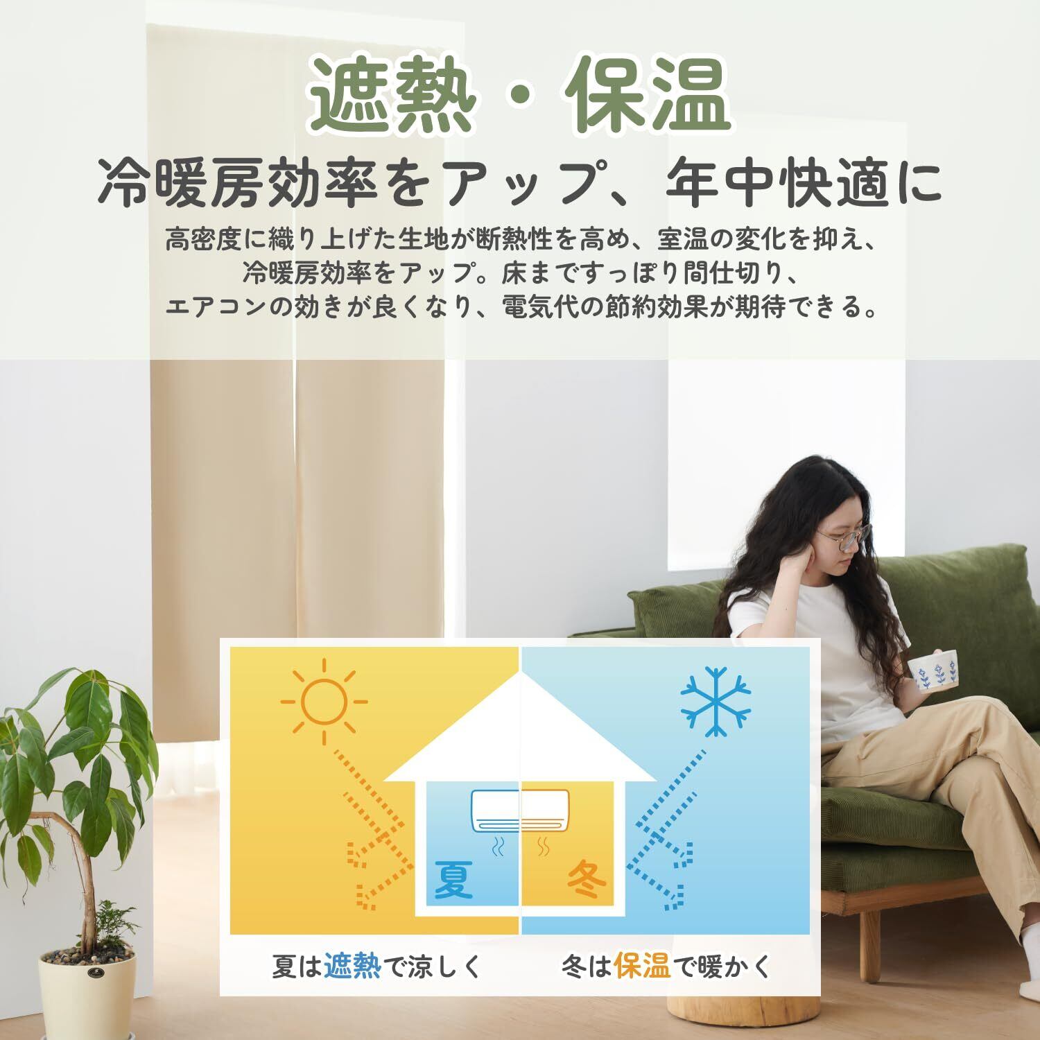 【遮熱保温・省エネ】高密度に織り上げた生地が断熱性を高め、室温の変化を抑えます。夏は熱気を遮断し、冷房の効率を向上。冬は外の寒さを防ぎ、室内の暖かい空気を逃がさずに暖房効率をアップ。ドアカーテンや階段の間仕切り、お部屋の仕切りとして使用することで、エアコンの温度調整がしやすくなり、電気代の節約が期待できます。