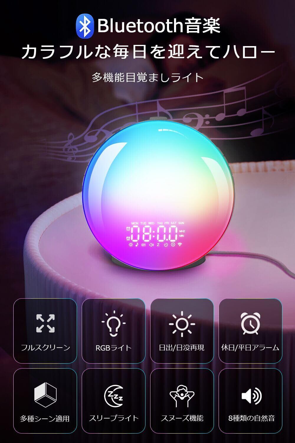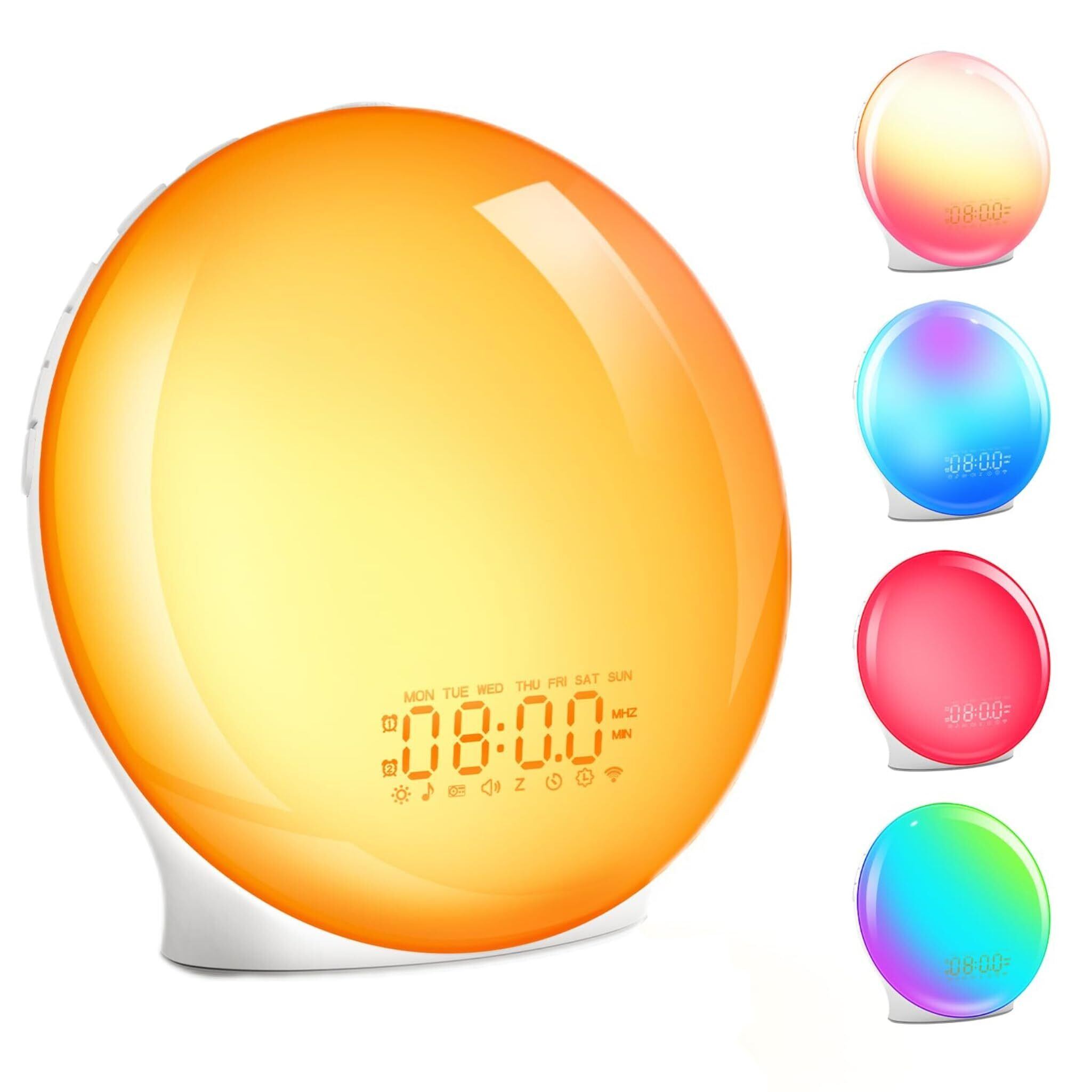 目覚まし時計 光 目覚ましライト めざまし時計 大音量 日の出&日没シミュレーション搭載 8種類自然音・20段階明るさ調整・16段階音量調節 光で起きる 置きどけい RGB/虹色ライト 光目覚ましどけい スヌーズ&FMラジオ機能付き 明るさ調整可 フルスクリーン照明 ベッドサイドランプ 授乳 寝室・子供部屋