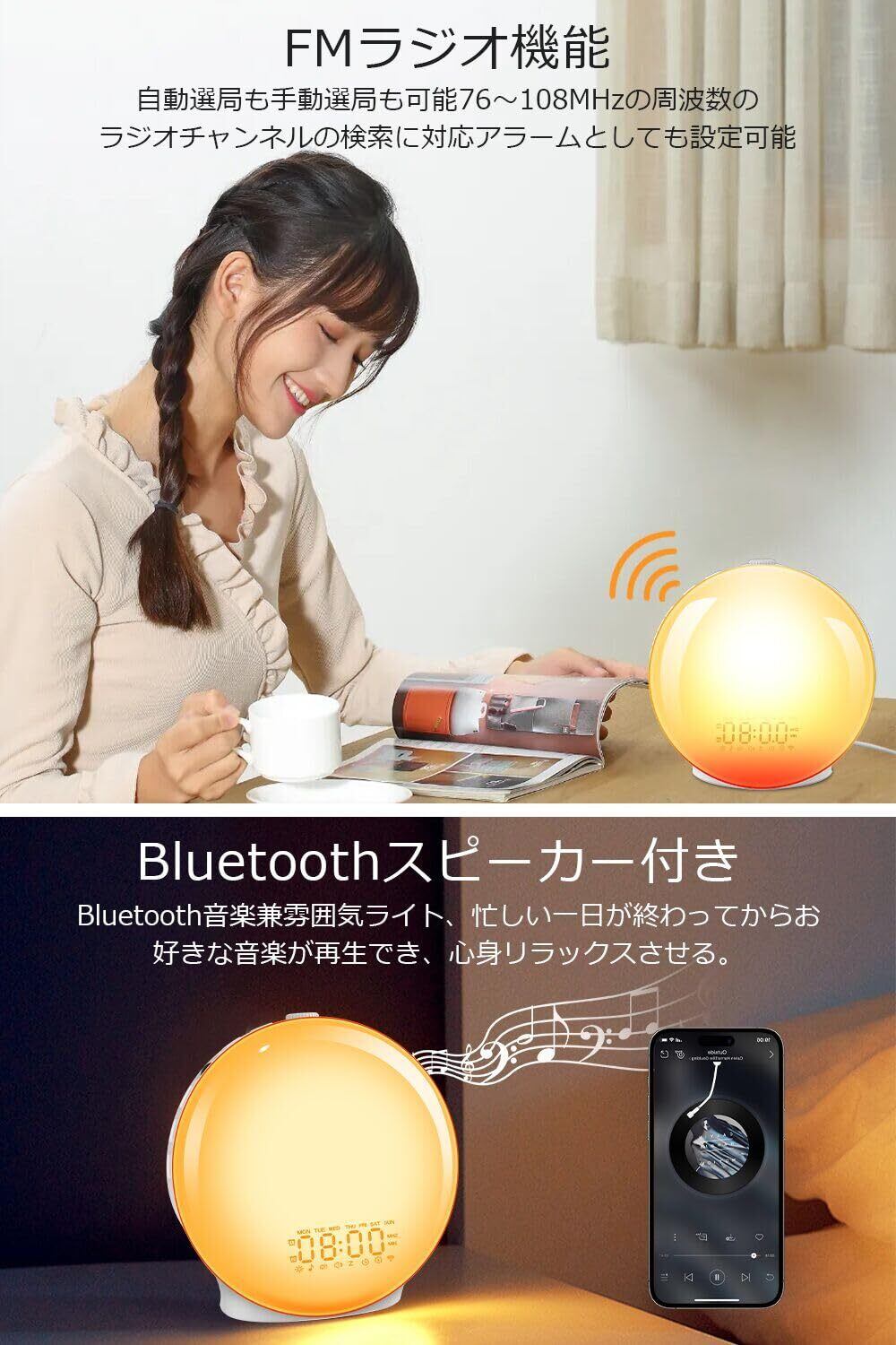 ▶【日の出・日没シミュレーション&Bluetooth音楽機能】 光目覚まし時計を一台置くだけで、朝の目覚めが変わります。暗い冬の朝でも日の出ライトモードが太陽のような光を再現し、自然に目が覚めます。フルスクリーン仕様で部屋全体を明るく照らし、心地よい一日をスタート。夜は日没ライトモードを使えば徐々に暗くなり、リラックスして眠りにつけます。(※点灯時間は起床の10~60分前または就寝の10~120分前に設定可) Bluetooth機能付きで、スマホなどのBluetooth対応機器と接続し、好きな音楽を再生できます。