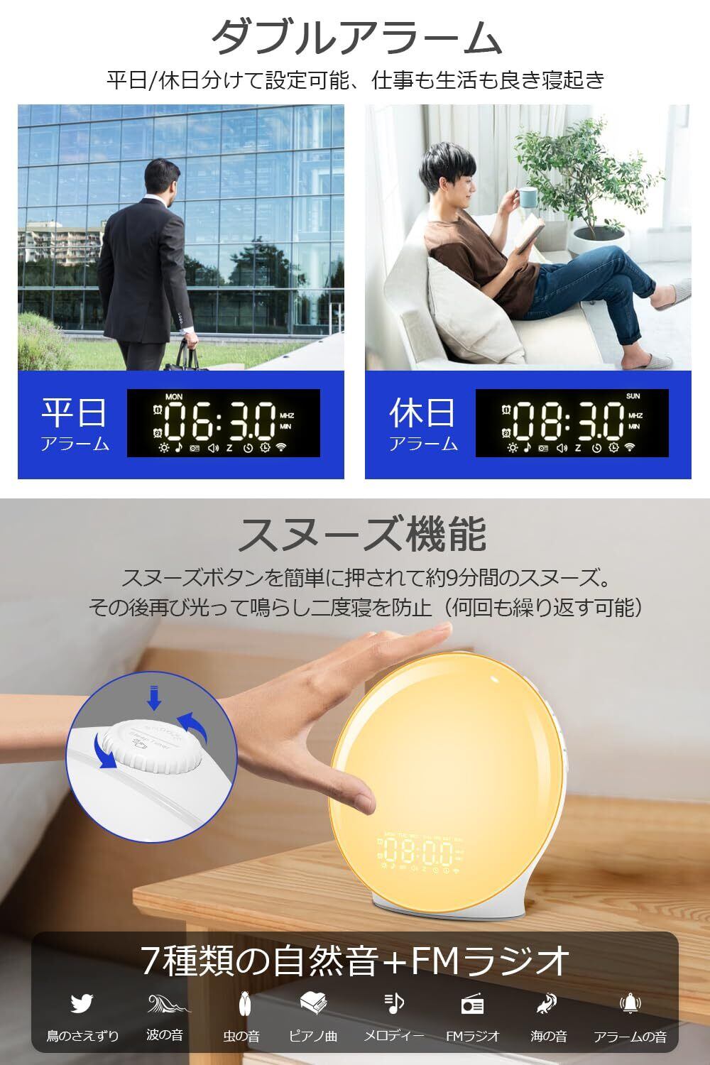 ▶【8種類の自然音アラーム&スヌーズ機能】 目覚ましライトには8種類の自然音を内蔵。鳥のさえずり・波の音・小川・オルゴールなど、多彩なサウンドで快適な目覚めをサポートします。スヌーズ機能付きで、アラームが鳴った時に大きなボタンを軽く押すだけで9分後に再アラーム。光で起きる+自然音のダブル効果で、心地よく一日を始められます。