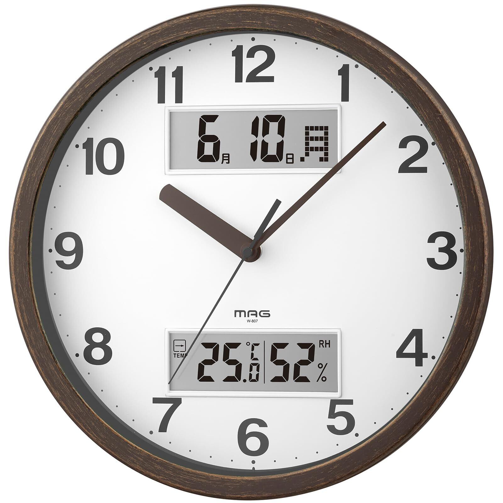 MAG(マグ) 掛け時計 壁掛け時計 アナログ おしゃれ インテリア 温度計 湿度計 カレンダー 静音 連続秒針 直径29.0㎝ 木目調 ブラウン ダブルポイント W-807A BR-Z ノア精密