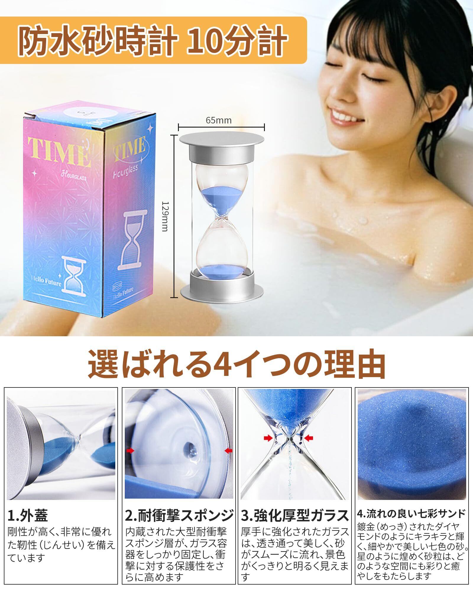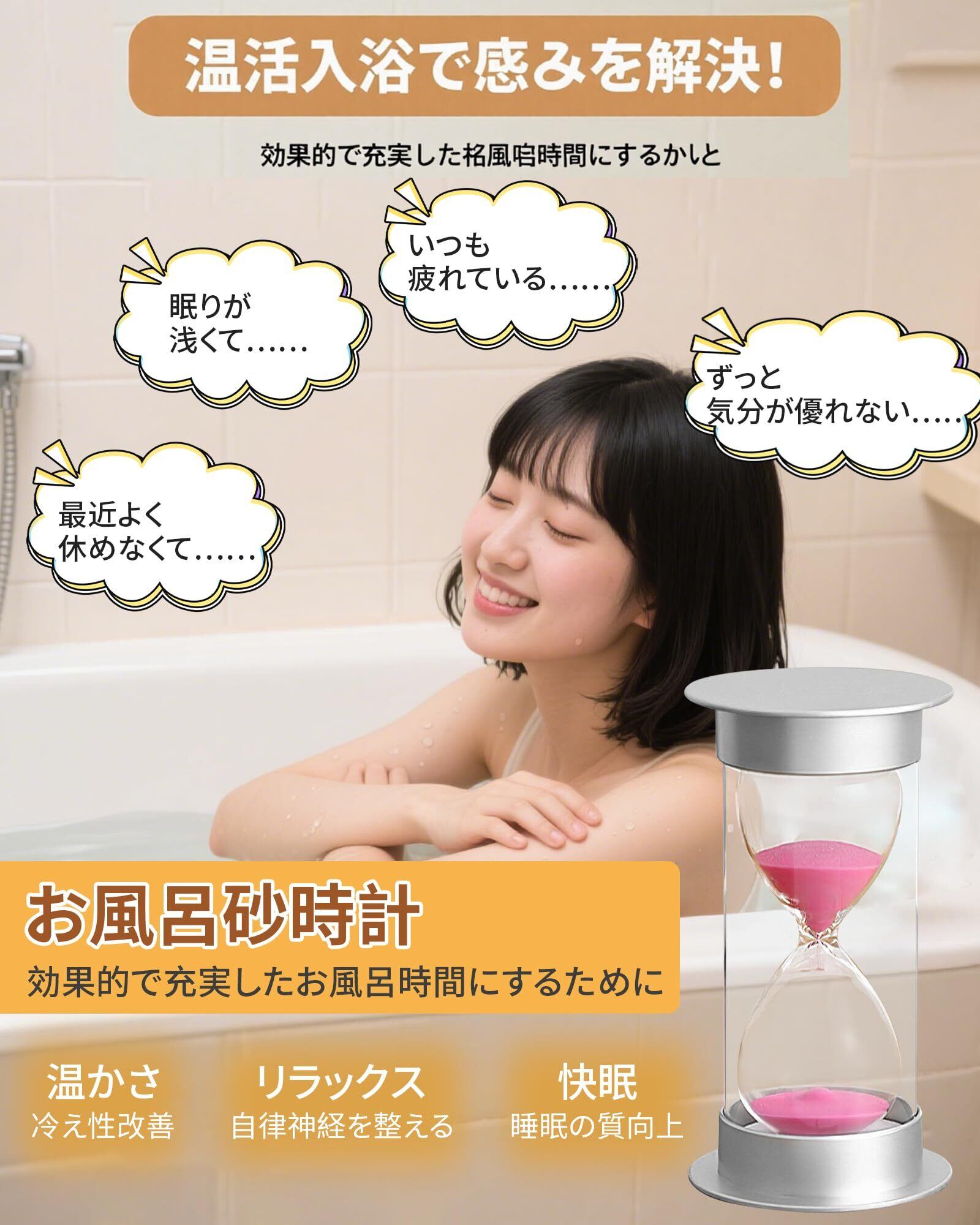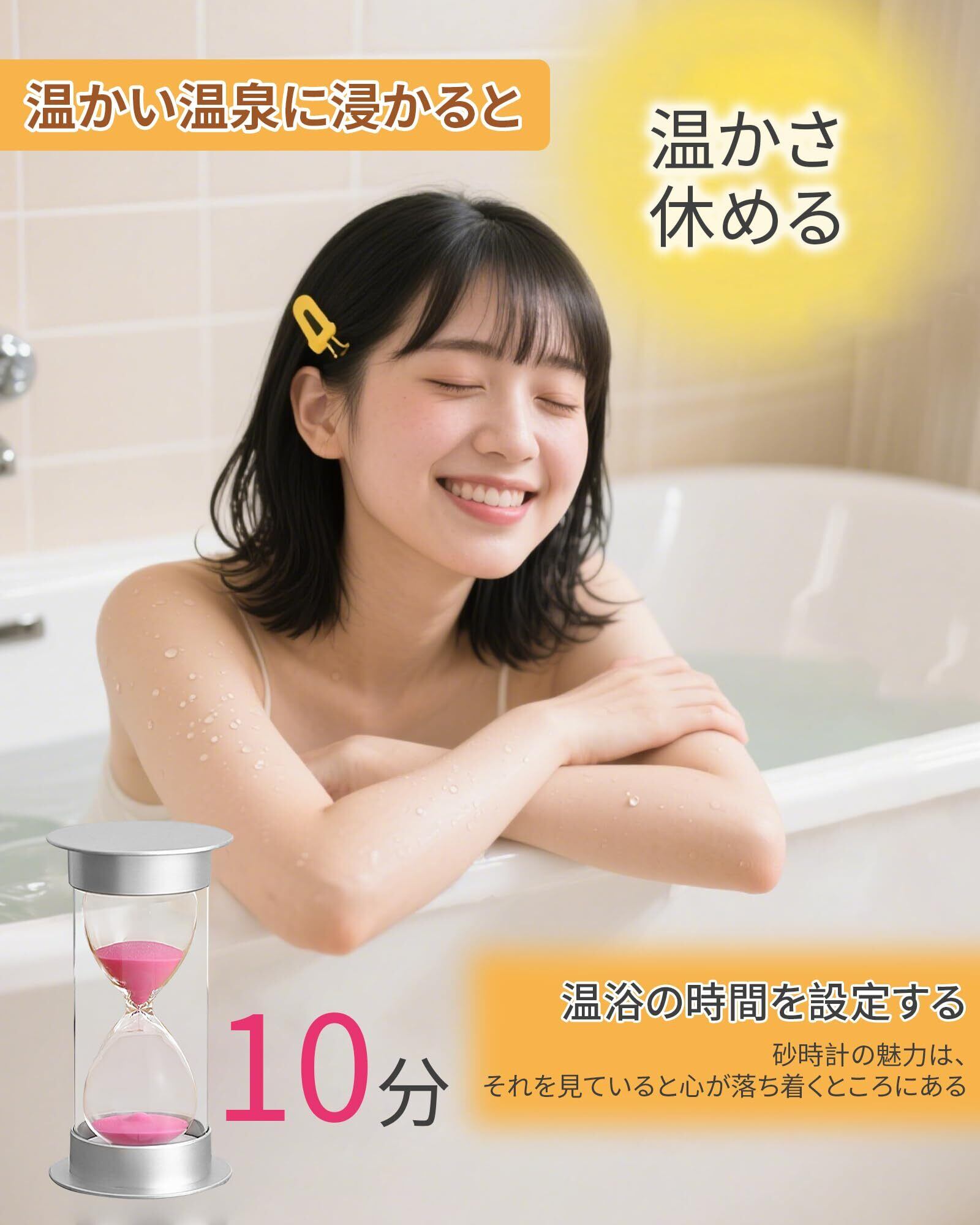 【温活に最適な10分計測で、芯から温まる時間をサポート】効果的な温活入浴の目安である「10分」をしっかり計測。砂が静かに流れ切るまでが、リラックスと身体を芯から温めるためのちょうどいい目安となります。タイマーを気にせず、くつろぎの時間をお過ごしください。