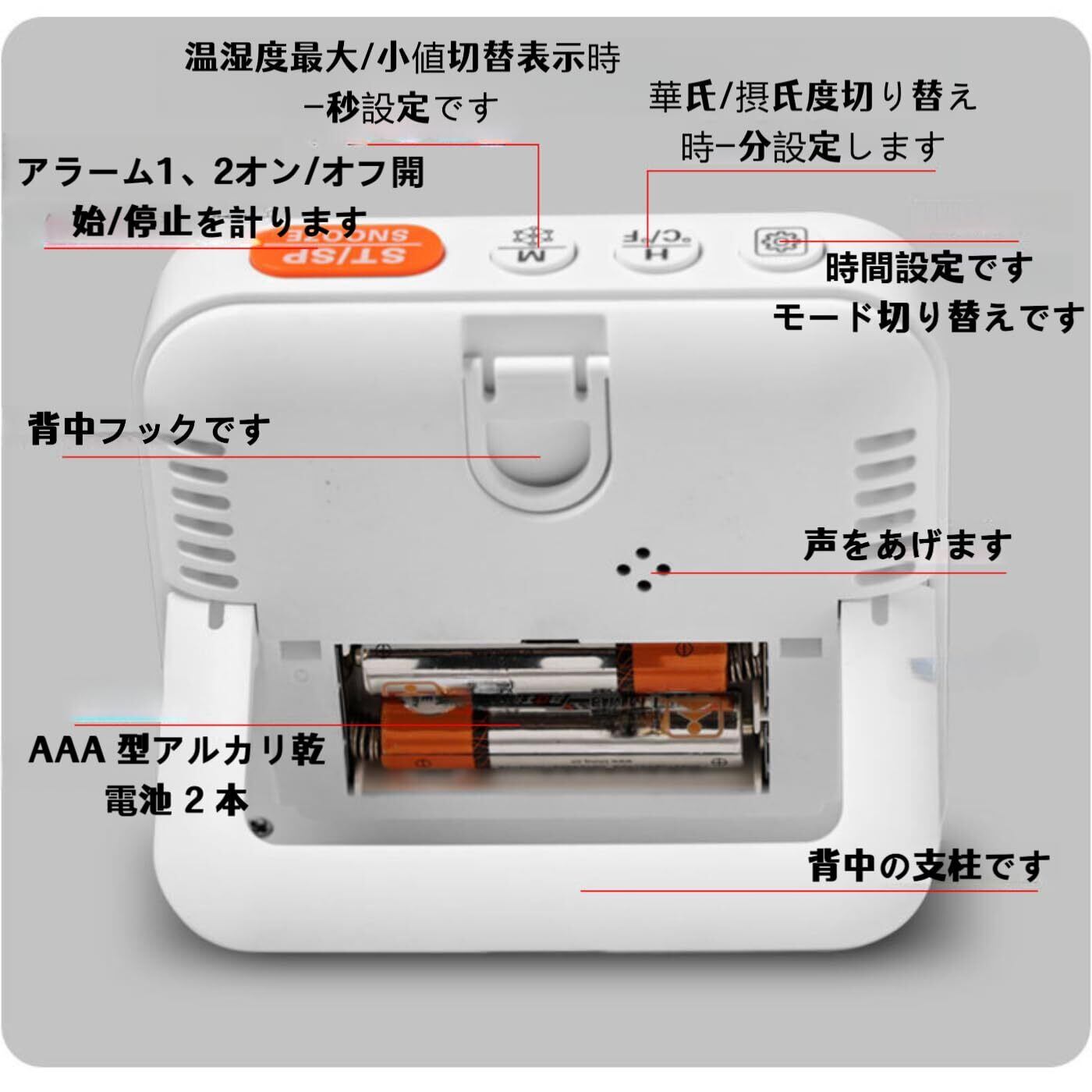 【多機能対応】12時間/24時間表示切り替え、2セットアラーム設定、カウントダウンタイマー、サイクルタイマー、華氏 / 摂氏温度単位切り替え、温湿度測定、大音量アラーム、静音 / 無音モード、居眠り防止機能を統合し、多シーンでの使用ニーズに応えます。(本品は防水仕様ではございません。水に濡らすと故障の原因となりますので、ご使用の際は十分ご注意ください)
