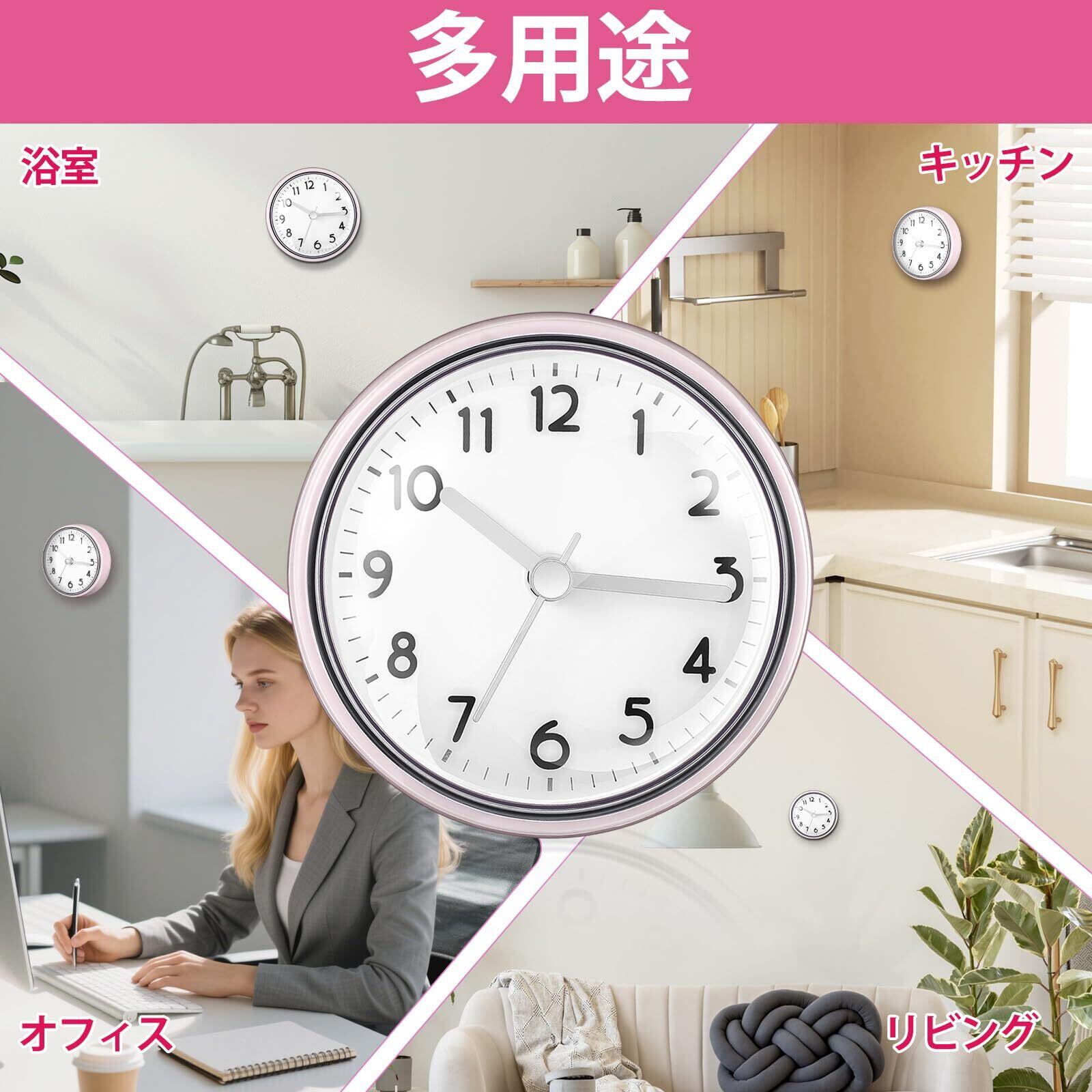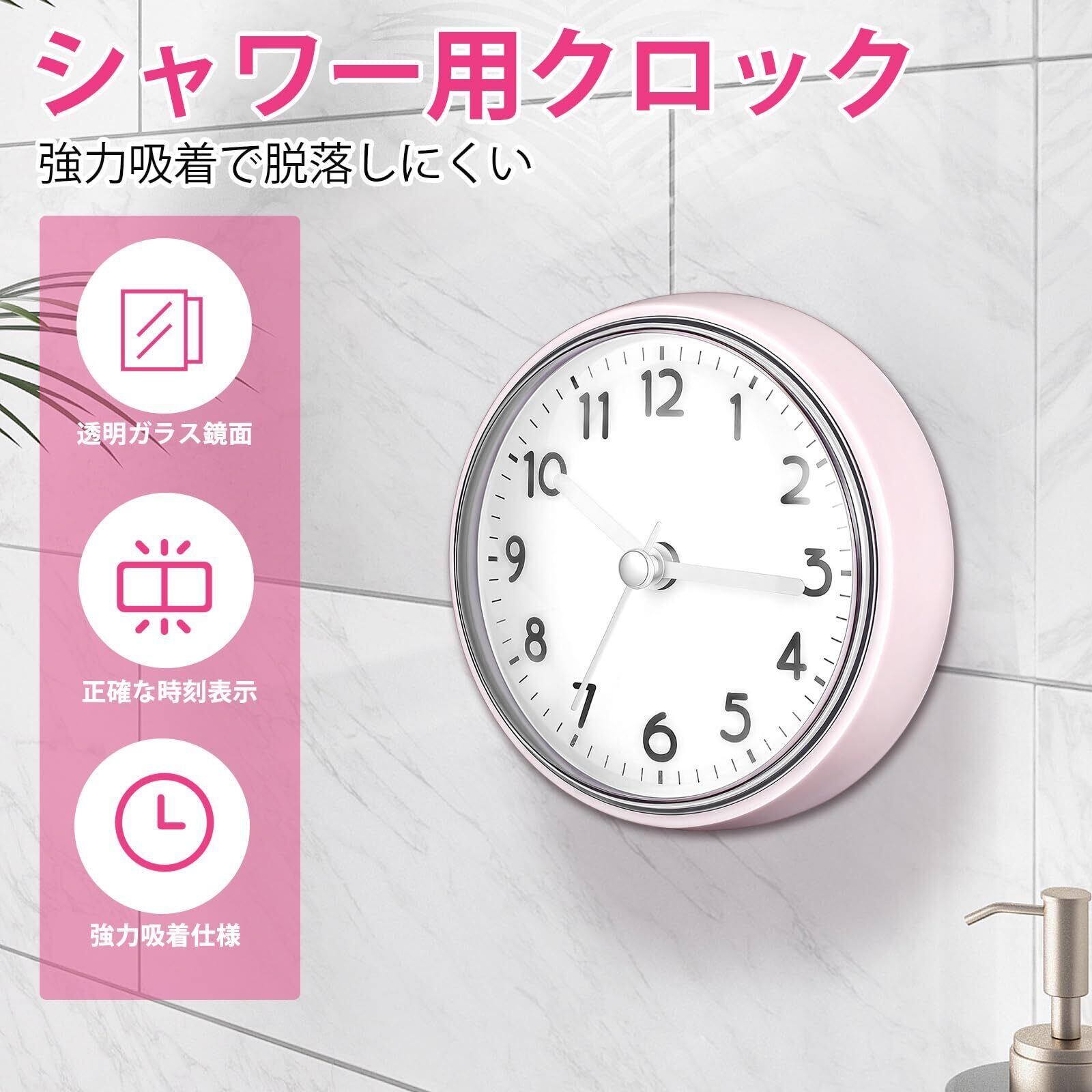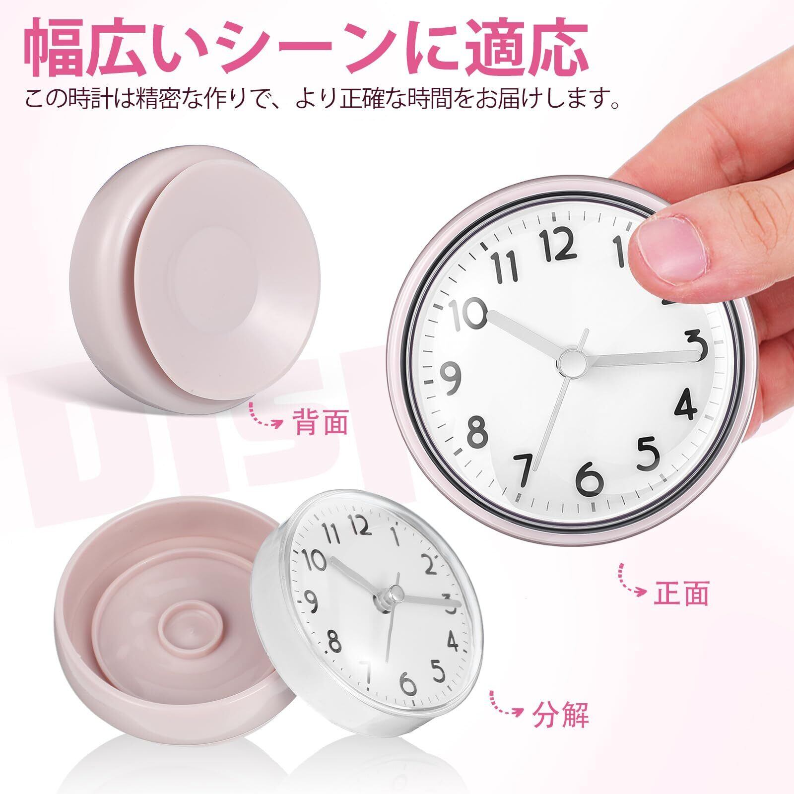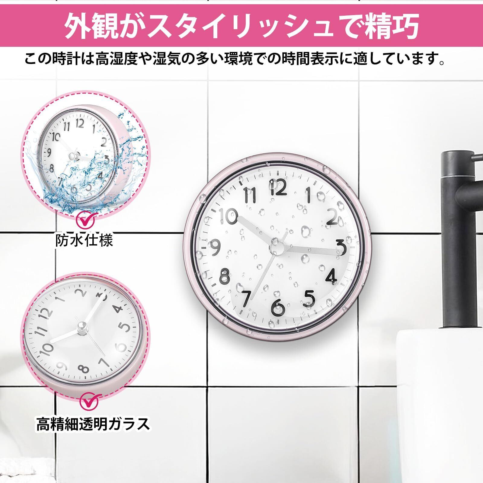 【吸盤で強力固定】背面の強力な吸盤により、ガラスやタイル、鏡などの平滑な壁面にピタッと吸着。穴開け不要で、洗面所やトイレの壁掛け時計として、賃貸でも気兼ねなく設置できます。