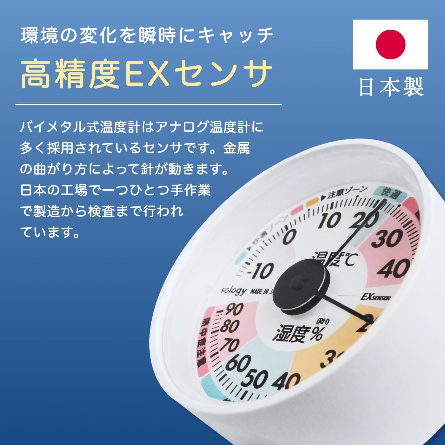 sology(ソロジー) 温湿度計 アナログ 日本製 EXセンサ 温度計 湿度計 ミニ 小型 高精度 電池不要 室内 見やすい アナログ 快適ゾーン 注意ゾーン 卓上 壁掛け 手のひらサイズ ホワイト