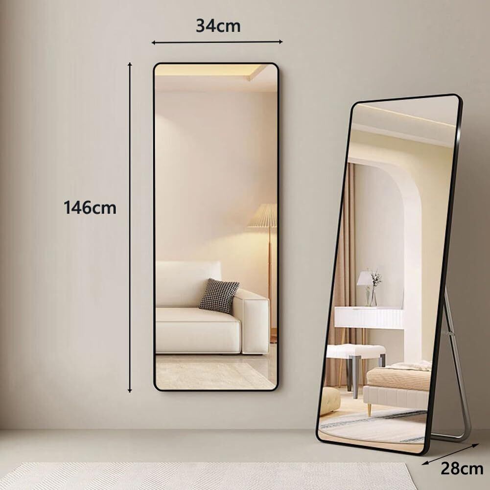 姿見鏡 全身鏡 ミラー スタンド鏡 完成品 壁掛けミラー 幅34×高さ146cm 立てかけミラー 壁掛け 飛散防止 スタンドミラー かがみ 折りたたみ 自立 軽量 薄型 アルミ合金 大型 おしゃれ 地震対策 (ブラック,146*34cm)