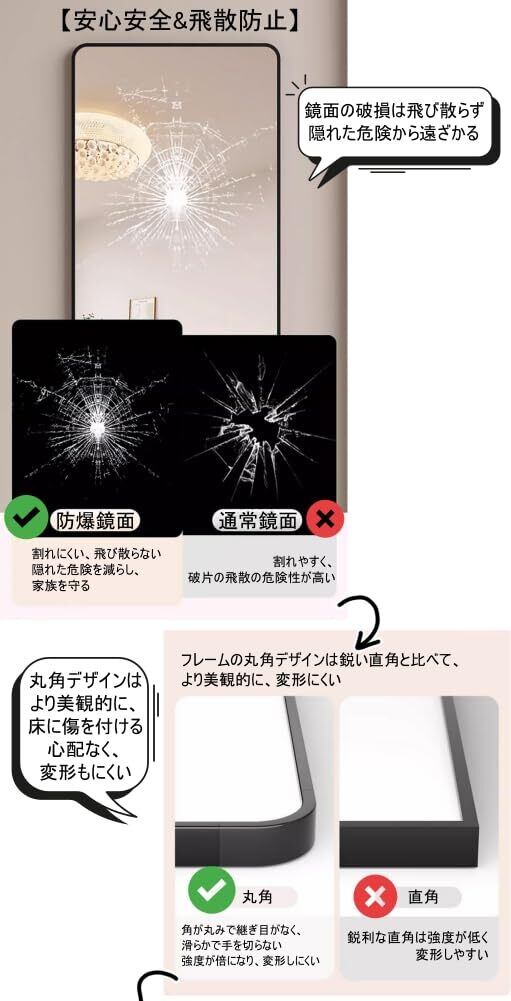 【デザイン】シンプルかつエレガントな外観で、さまざまなインテリアスタイルに自然に調和します。高精細な鏡面はクリアな映り込みを実現し、全身の確認をサポートします。環境に配慮したアルミニウム合金製のフレームは、軽量でありながらも高い強度と耐久性を備えています。