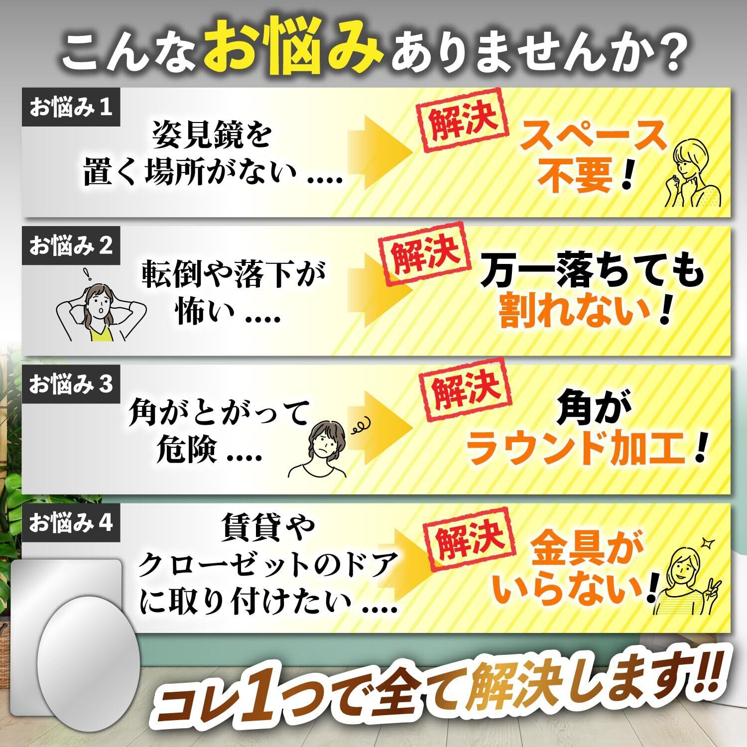 【皆様のお悩みを解決】 クローゼットやトイレのドアに貼りたい 落下や飛散が怖い とがった角でケガをしそう 賃貸住宅で壁掛けができない 赤ちゃんの知育用ミラーを探している このようなお悩み・不安を解決するために開発しました。 ※防水・曇り止め加工はしておりません。浴室ではご使用いただけません。