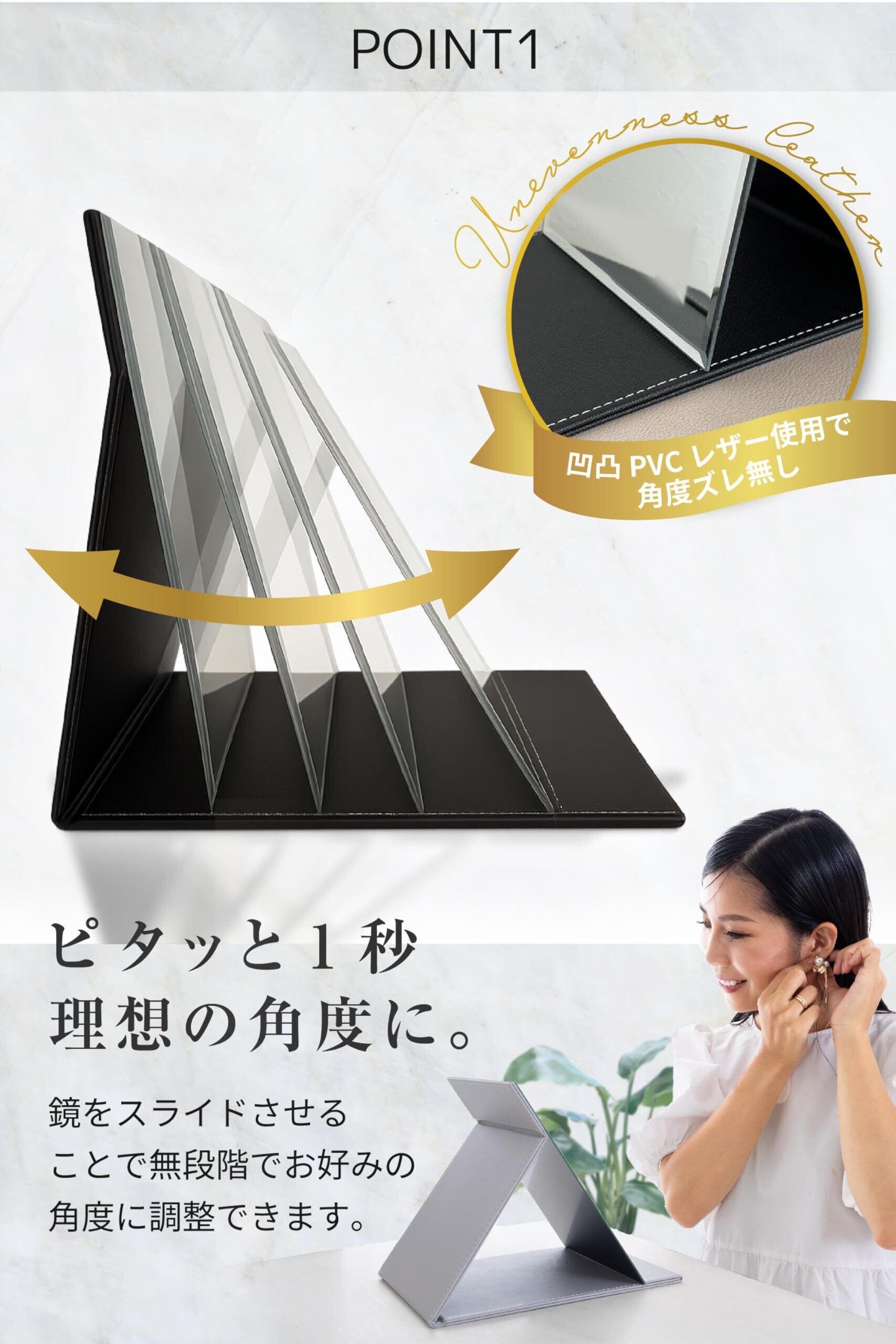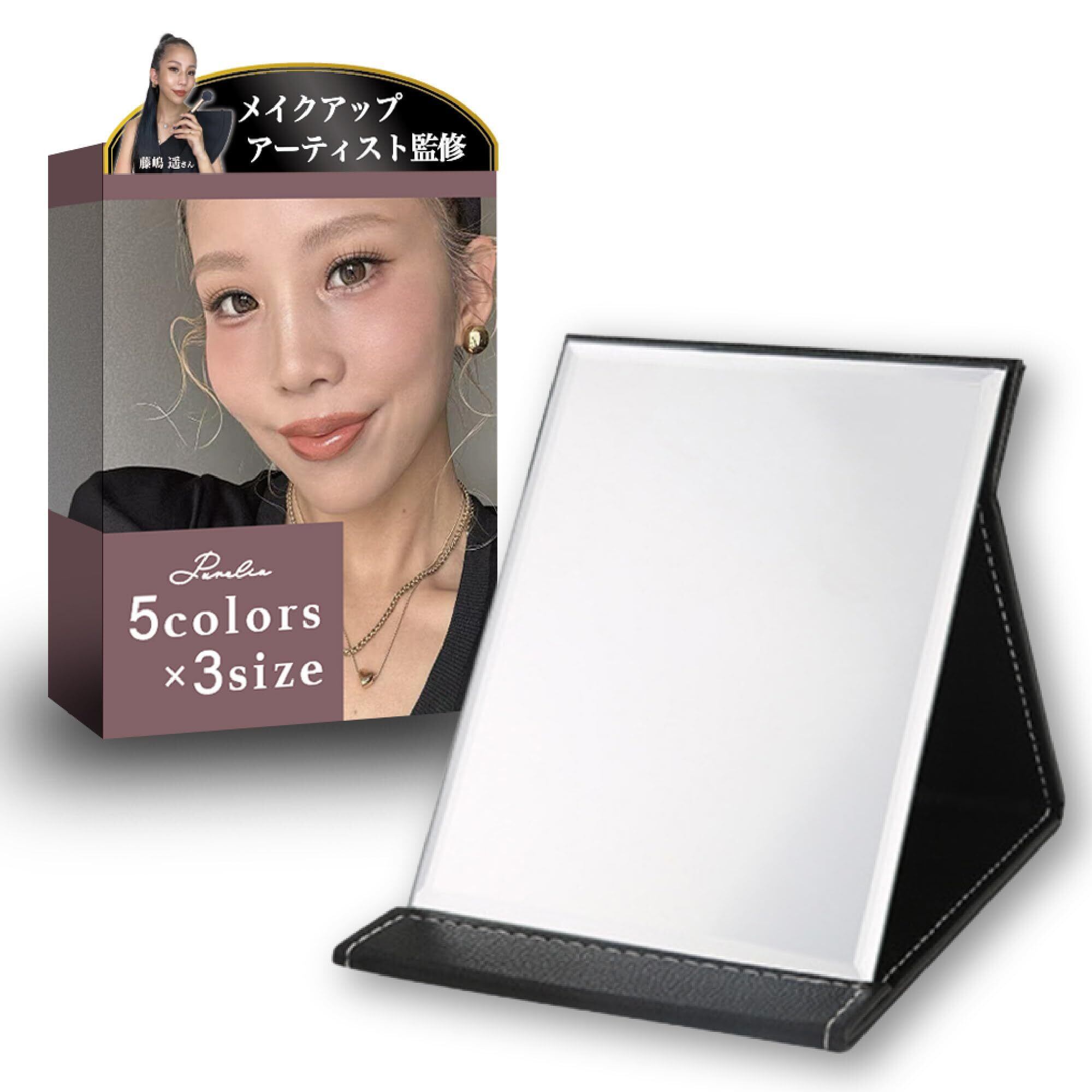 【新着商品】卓上ミラー 卓上鏡 化粧鏡 メイクミラー 折りたたみ 角度調整 軽量 大きめ 持ち運び PVCレザー 汚れに強い メイクアップアーティスト監修 (ブラック, 長さ17 x 幅12 cm)