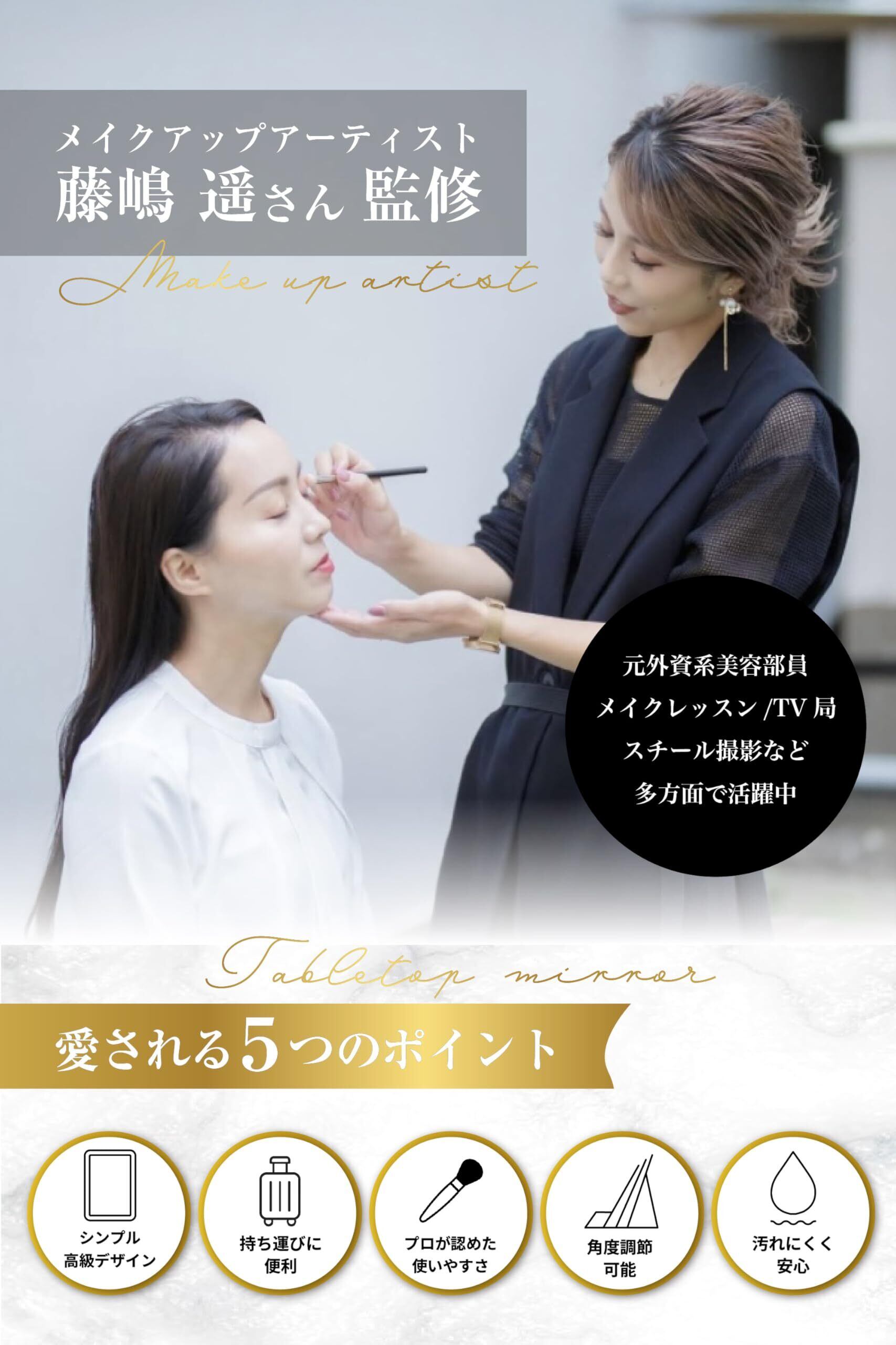 【角度調整できる自立式で、見やすい位置に合わせやすい】 無段階で角度調整ができるため、座ったままでも立ったままでも見やすい角度に合わせやすい卓上ミラーです。縁なしで鏡面が広く見えるため、メイク時にも顔全体を確認しやすいのが特長。メイクアップアーティスト監修のもと、使いやすさと見やすさに配慮した設計です。