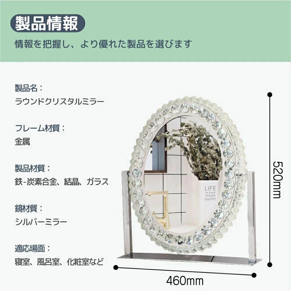 【高品質素材を使用】 鉄-炭素合金、ガラス、クリスタルを贅沢に使用。耐久性に優れ、鏡面はシルバーミラー仕様で色味の再現性も高く、自然な肌色を正確に映し出します。