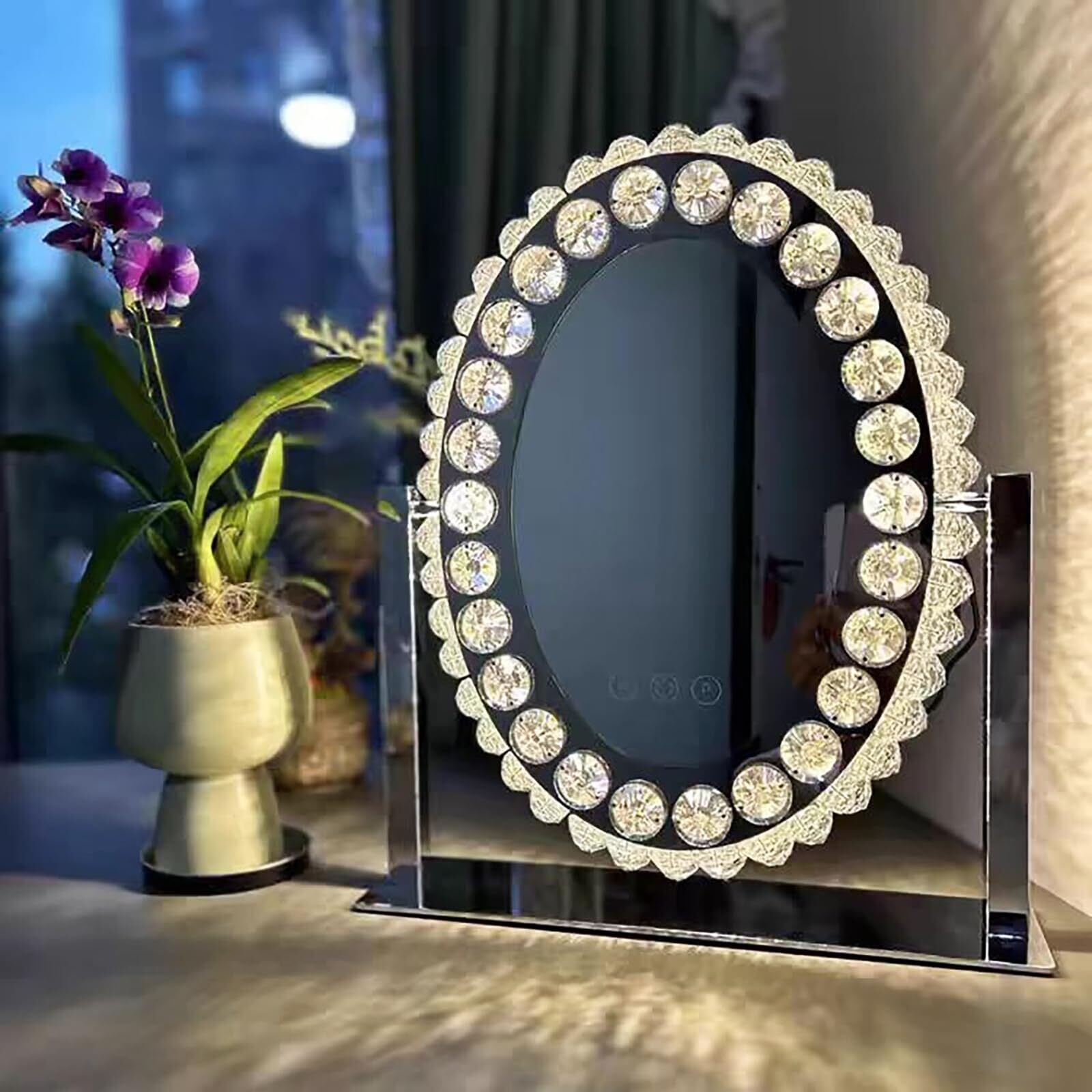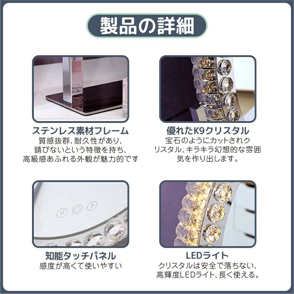 美しく、機能的で、使いやすい。 Skypearlの女優ミラーは、日々のメイクタイムを極上のひとときへと変える“魅せる”化粧鏡です。 ◎プロ仕様の明るさ調整 高輝度LEDを搭載し、「電球色」「自然光」「昼白色」の3色調光が可能。顔色をリアルに映し出すだけでなく、明るさはタッチ操作で無段階に調節できるため、時間帯や部屋の光量に関わらず理想的なメイク環境を実現します。 ◎スムーズなタッチ操作&メモリー機能付き ミラー表面に搭載されたタッチパネルで電源のオンオフ、光モード切り替え、明るさ調整がすべてワンタッチ。さらに、記憶機能付きなので、前回の設定をそのまま保持し、次回も快適に使用可能です。 ◎角度調整スタンドミラー 上下角度調整する可動式スタンドで、鏡の角度を上下に調整可能。自然な視線で顔全体を確認でき、細かいメイク直しやアイラインの調整、スキンケアチェックにも大活躍。 ◎高級感あるデザインでインテリアにも◎ ミラーを囲むクリスタルフレームが、まるでダイヤモンドのように光を反射。金属素材のフレームと調和し、シンプルながらもリュクスな雰囲気を放ちます。使わないときでもお部屋のアクセントになる美しい存在感。 ◎さまざまなシーンにマッチ 寝室や洗面所、化粧台、またはホテルの洗面スペースやサロンでも活躍。設置も簡単で、スタンド式だから場所を選ばず、贈り物としても人気のアイテムです。