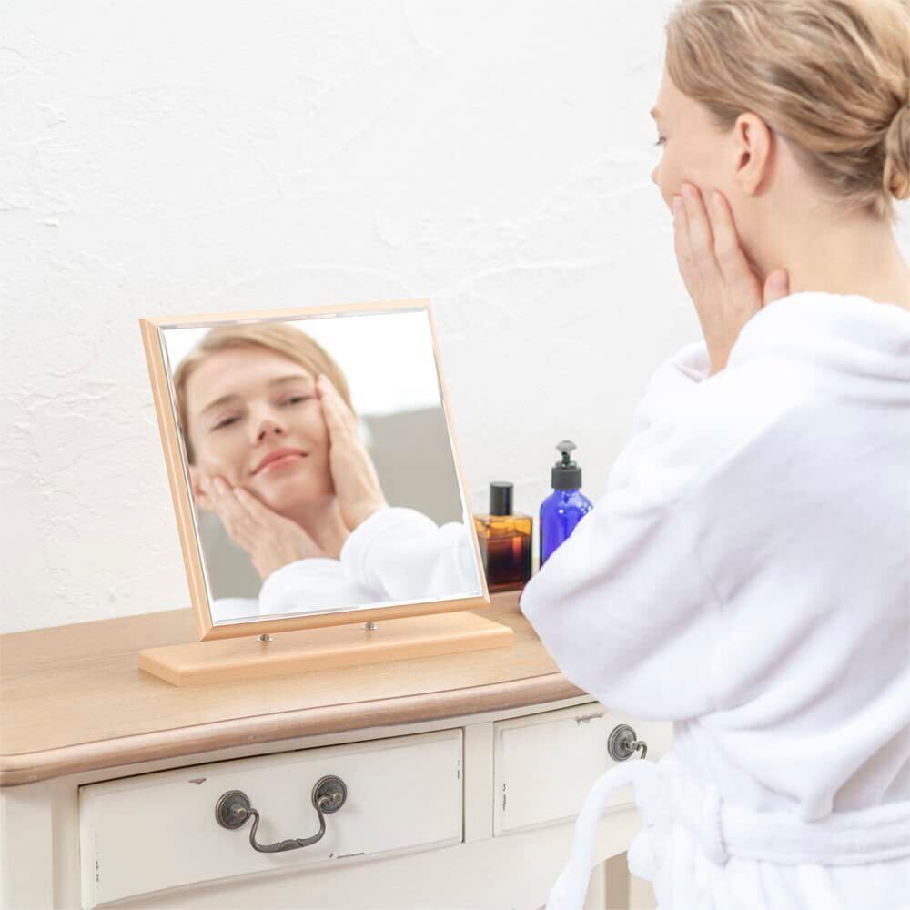 【メイクがしやすい】角度調整が簡単で、合わせたい角度にピタッと止まります。卓上鏡としては大きめで見やすく、メイクやヘアセットが楽しくなります。台座にはMDF(中密度繊維板)を使用しており、厚みと重みがしっかりあります。そのため、スリムでありながら安定感がある台座になっています。全体サイズ:約302mm x 290mm x 78mm 重量:約1,115g