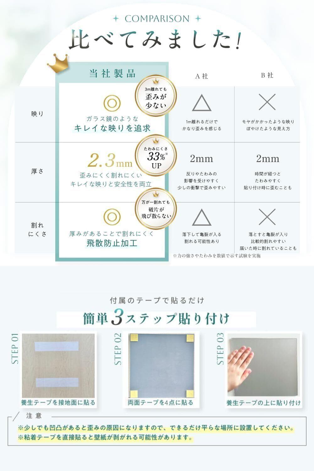 【優れた耐衝撃性】厚みを2.3mmにすることで、従来品の厚さ2mmより耐衝撃性が1.5倍にアップ。ガラス鏡に比べて約10~20倍の割れにくさを実現しました。