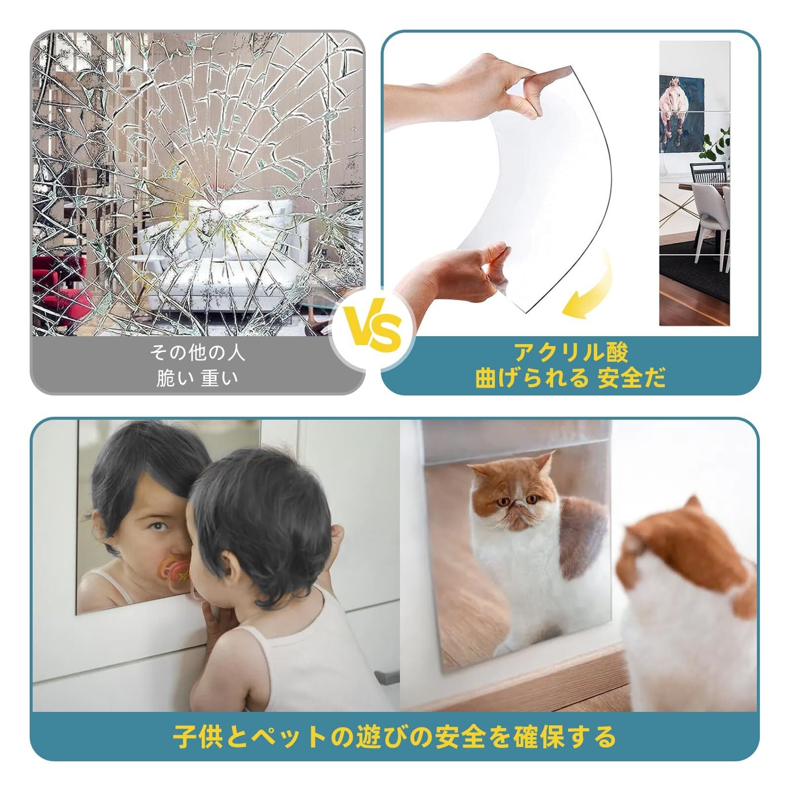 【鮮明な反射】斑点も欠陥もなく、鮮明で高精細な画像を提供します。 私たちのアクリル鏡はガラスに比べて少し濁っていますが、ほとんど同じくらいいいです。 鏡に保護フィルムがついていますので、使用前にはがしてください。