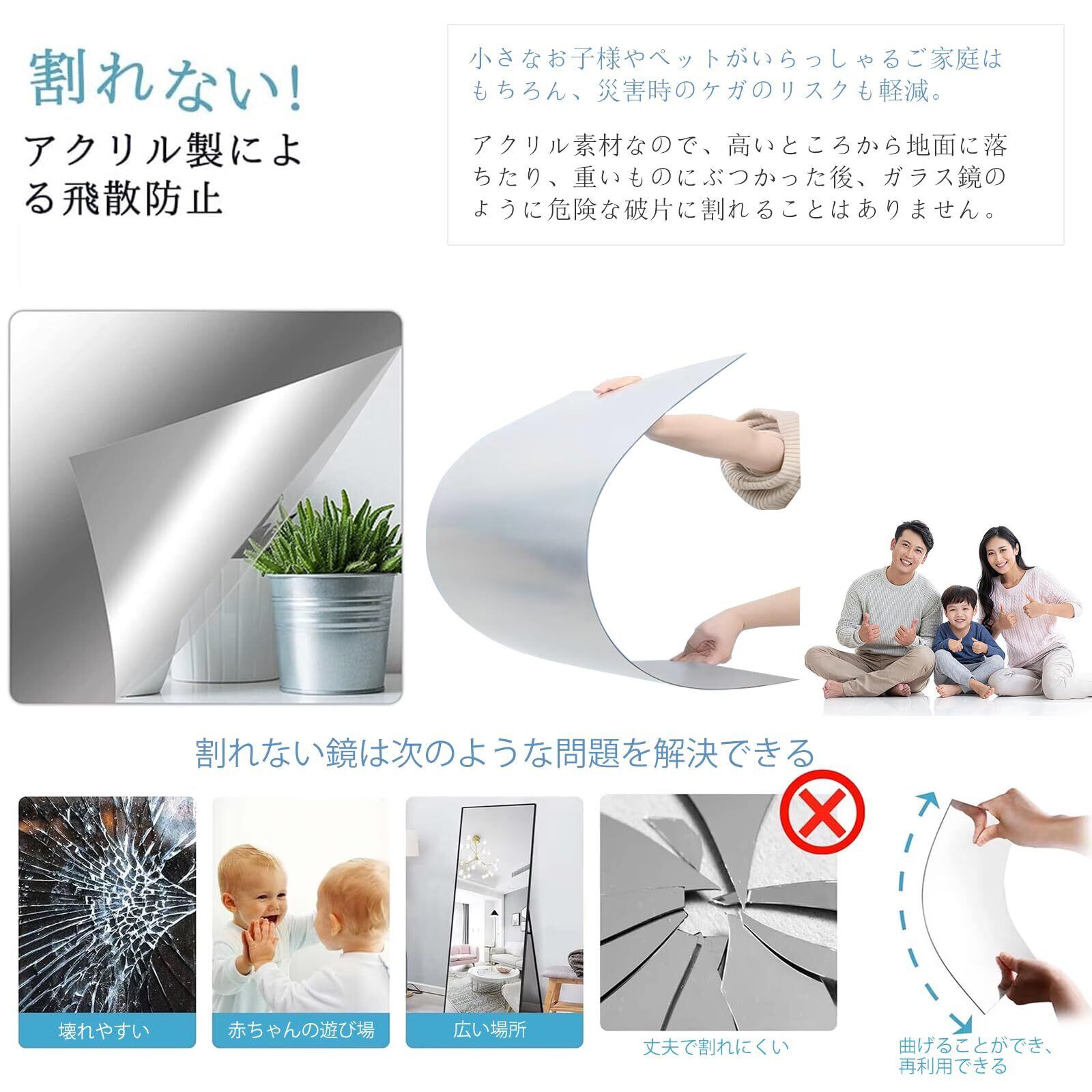 【割れにくい&地震対策より安全に】アクリル製のフィルムミラーはガラスより耐衝撃性が高く、割れにくいため、子どもやペットがいる家庭でも安心です。壁 鏡やドア掛けミラーとして使え、割れない 全身鏡としても便利です。鏡 シールのように簡単に貼り付けられ、ミラー 軽量で扱いやすく、地震時にも安全です。
