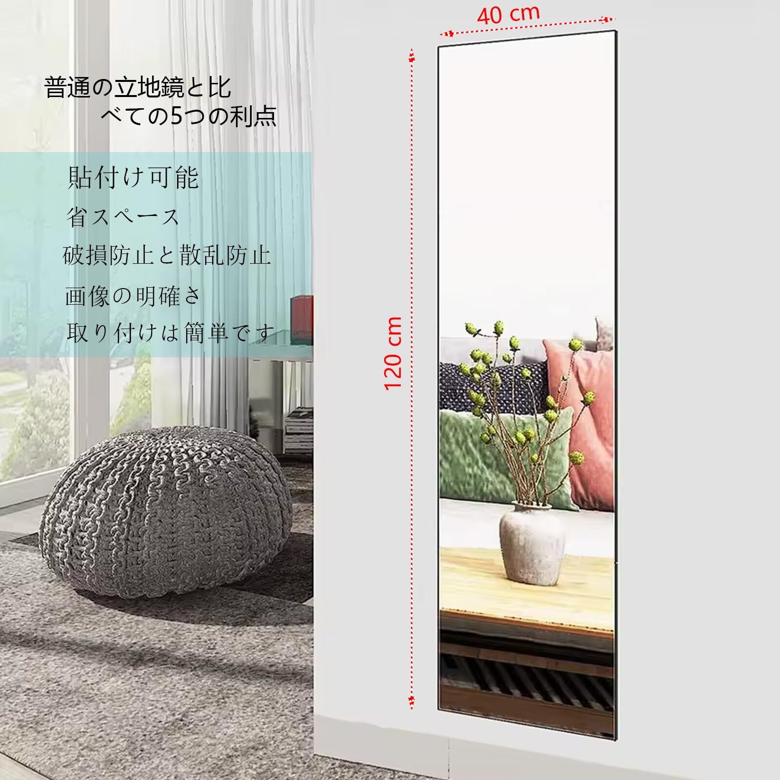 割れない軽量ミラー(40*120cm 1枚)耐衝撃・飛散防止設計で、クローゼットや玄関にもぴったり。アクリル素材で軽量、透明度が高く歪みも軽減され、映りが綺麗です