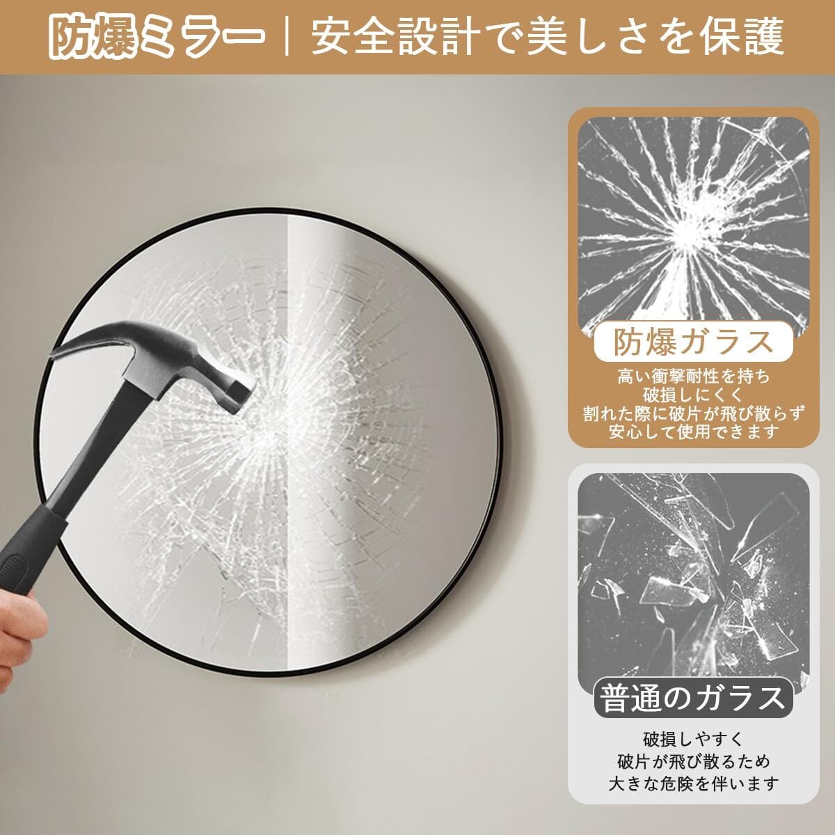 【飛散防止】割れても破片が飛び散らない防爆フィルムを施した壁掛けミラー。5mm厚の高品質シルバーミラーを採用し、耐衝撃性に優れた設計で安心して使用できます。お子様のいる家庭や玄関、バスルームにも最適です