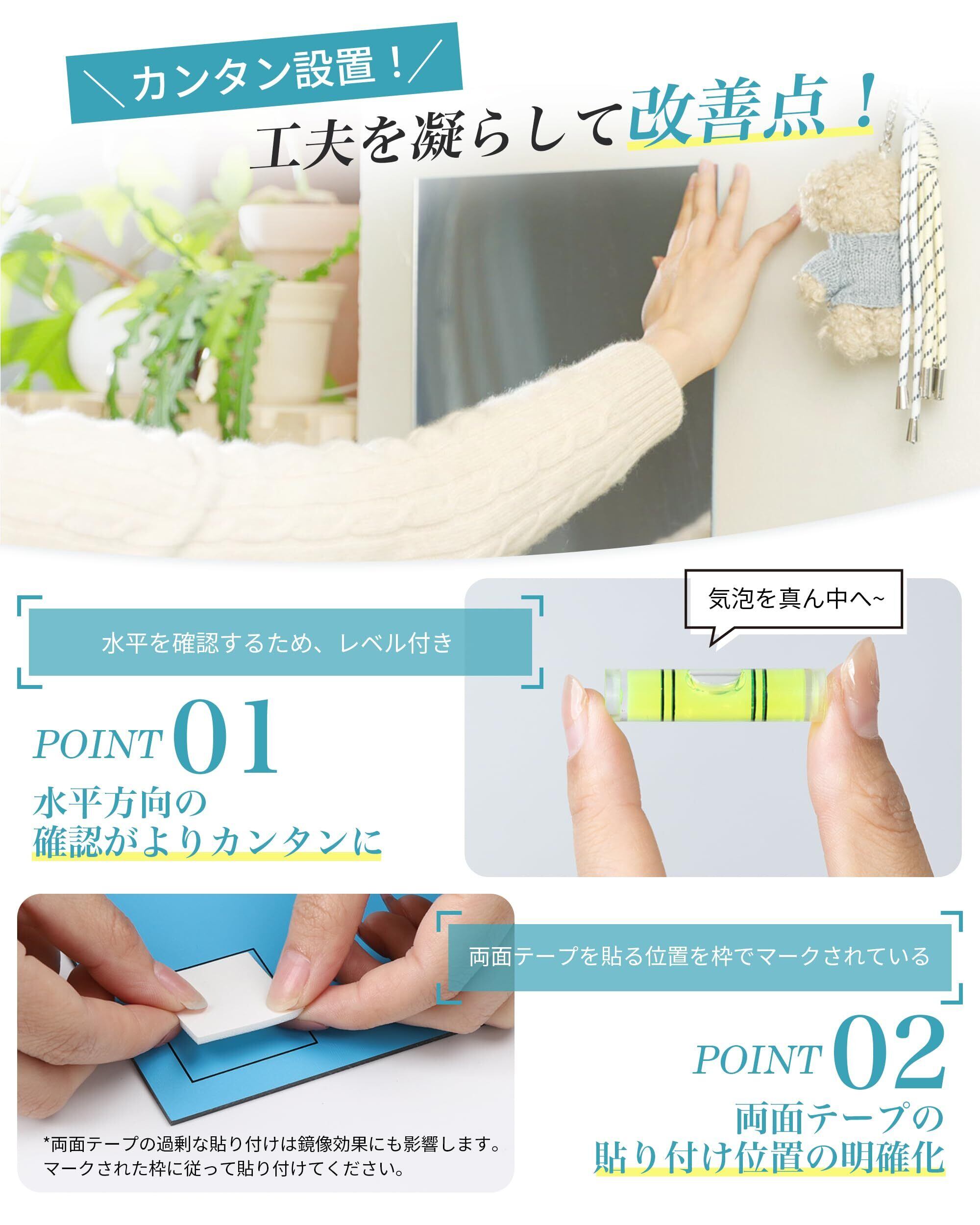 【カンタン設置!】超軽量の壁掛け鏡!同じ大きさのガラス鏡の重さの1/6だけで、工具・工事・壁に穴を開けること一切不要!女性一人でも軽々設置!付属の粘着シールで貼るだけで完了!