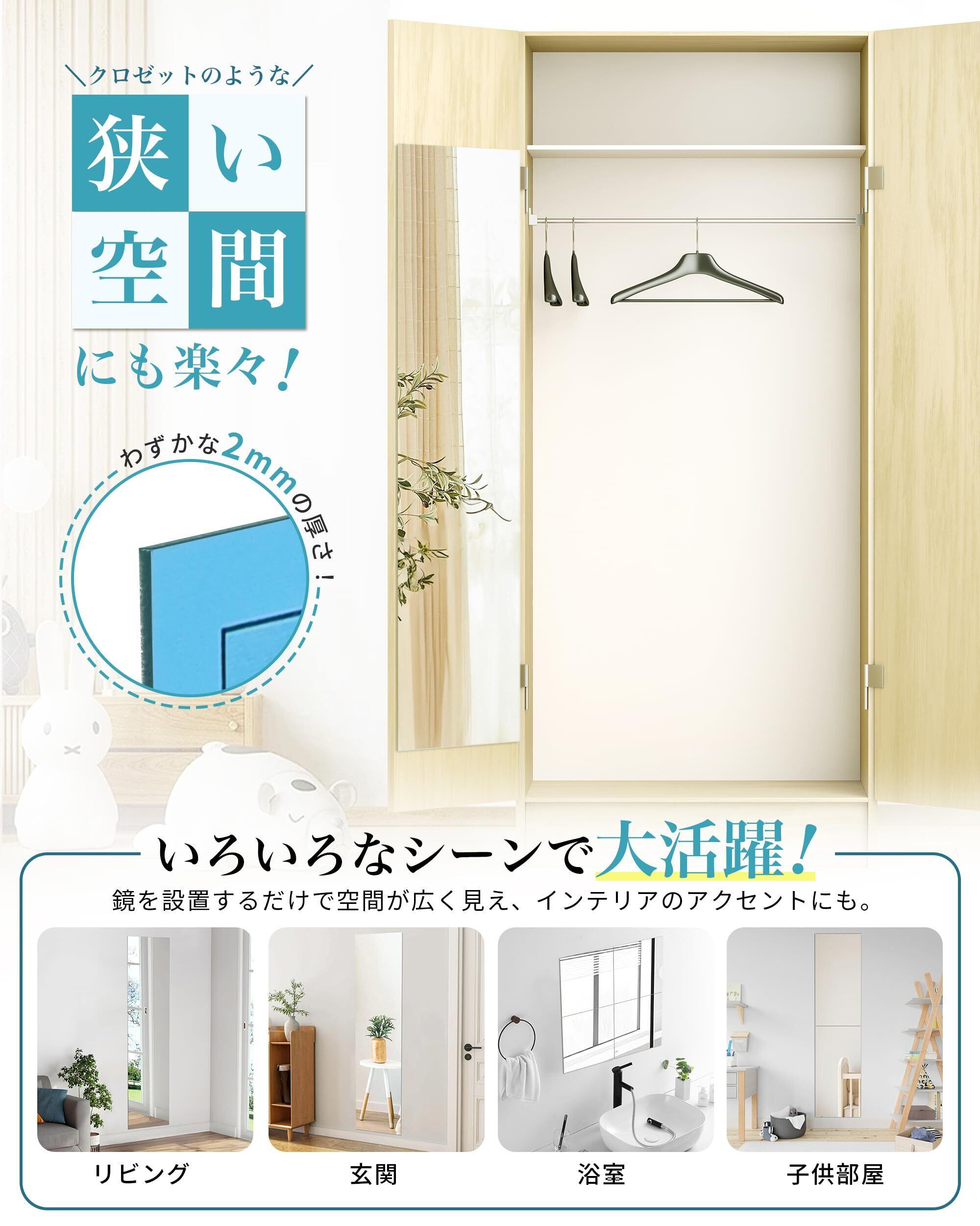 【2mmだけの薄型、狭い空間にも楽々!】わずかな2mmの厚さ、どこでも貼れる割れれない姿見鏡!玄関、洗面所、浴室、脱衣室などはもちろん、クロゼットような狭い空間にも設置でき、場所を取らない。出かけ前のチェックやスタイルチェックに便利。トレーニングやダンス練習なども使える。