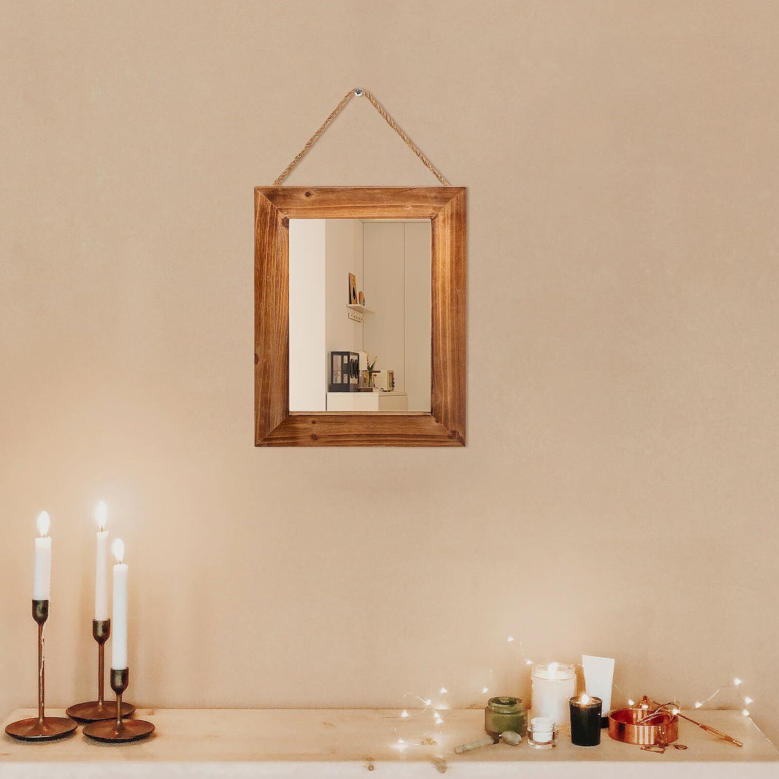 【装飾に最適なサイズ】当社の長方形ファームハウスウォールミラーフレームのサイズは40x30cmで、壁掛けディスプレイに適しており、このウォールミラーには麻ロープが付いています。茶色の木製ミラーフレームはバスルームや寝室への設置に適しています。 、リビングルーム、ドレッサー、キャビネット、ポーチ、玄関など。