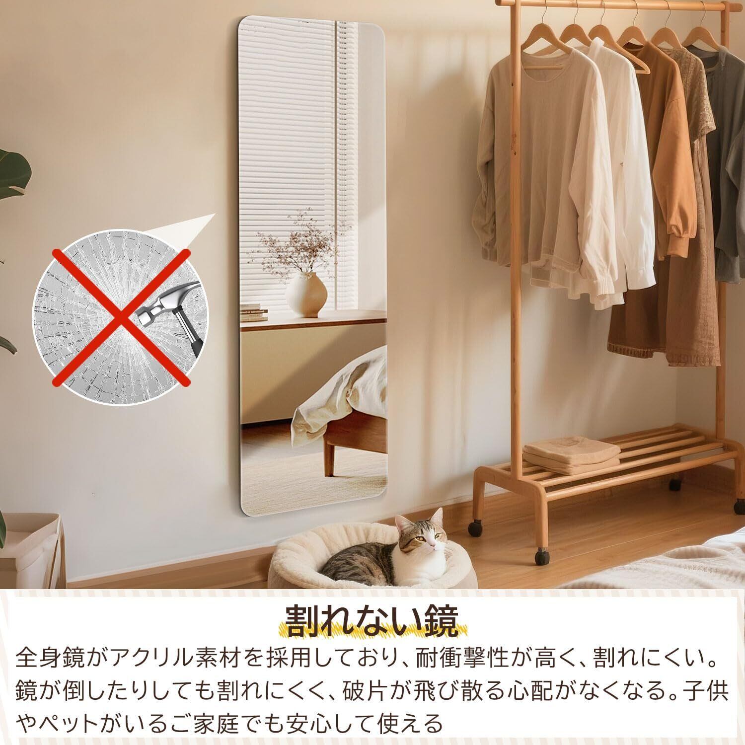 [割れない鏡]全身鏡がアクリル素材を採用しており、耐衝撃性が高く、割れにくいです。鏡が倒したりしても割れにくく、破片が飛び散る心配がなくなります。子供やペットがいるご家庭でも安心して使えます。地震など災害時からも家族を守ってくれます。