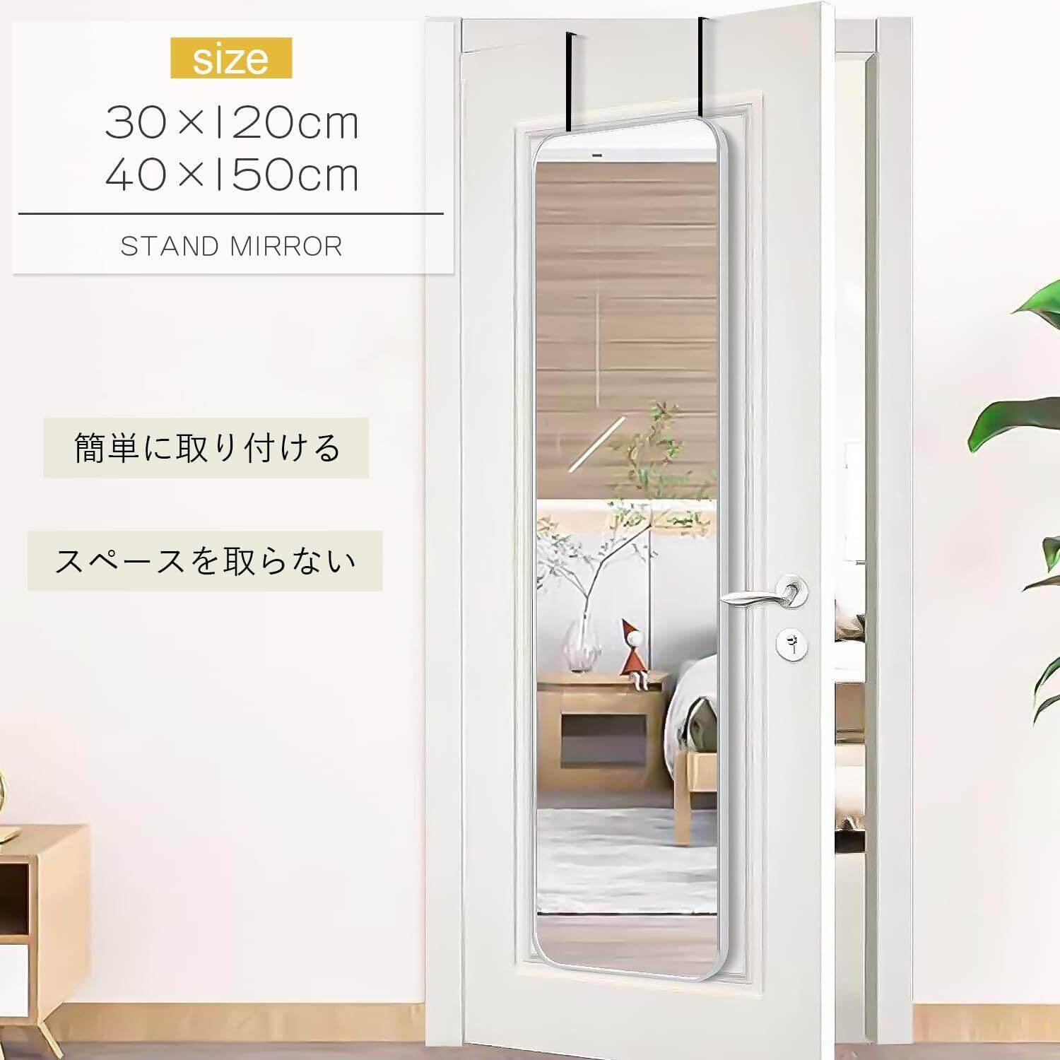 【広い視野で自由な設置】当社の全身鏡は、120cm×30cmと150cm×40cmの2サイズをご用意。広々とした視野で、全身を一度に確認できるクリアな見え味が特徴です。付属のマルチフックを使えば、壁やドアへ簡単に掛けられ、お好みのスペースにすっきり収まります。寝室や玄関、洗面所など、さまざまなシーンでご活用いただけます