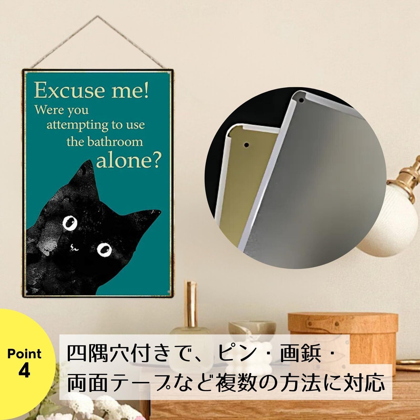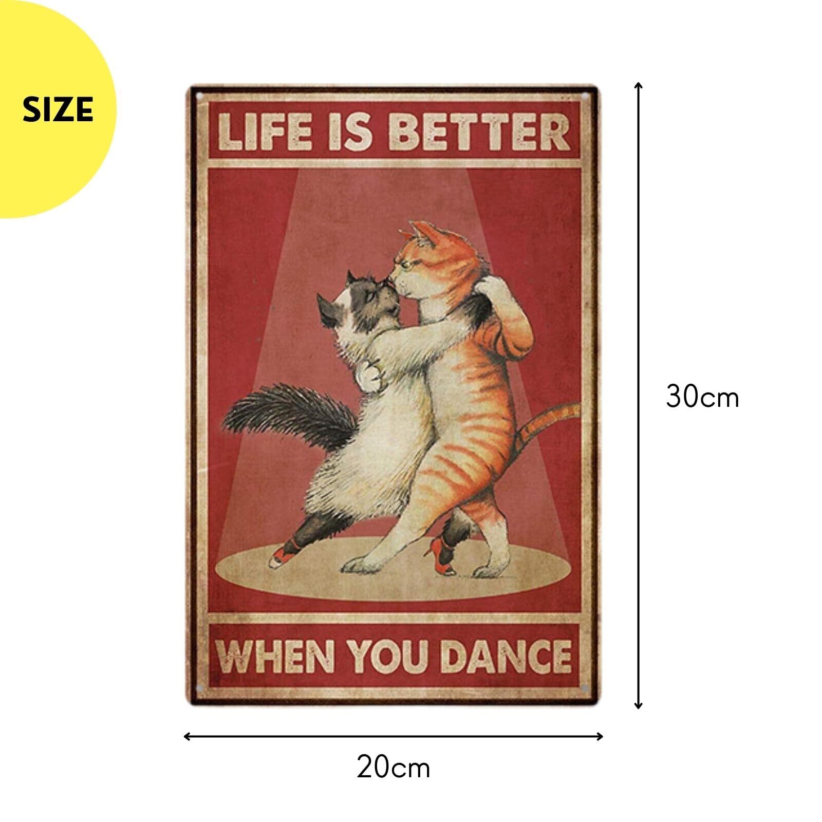 【サイズ・バリエーション】サイズ:約20×30cm。おしゃれな猫モチーフのブリキ看板です。豊富なデザイン展開(ダンス、読書、庭、料理、コーヒー、ユーモア系など)からお選びいただけます。四隅に穴があり、画鋲・ピン・ロープ・両面テープ等で簡単設置可能。