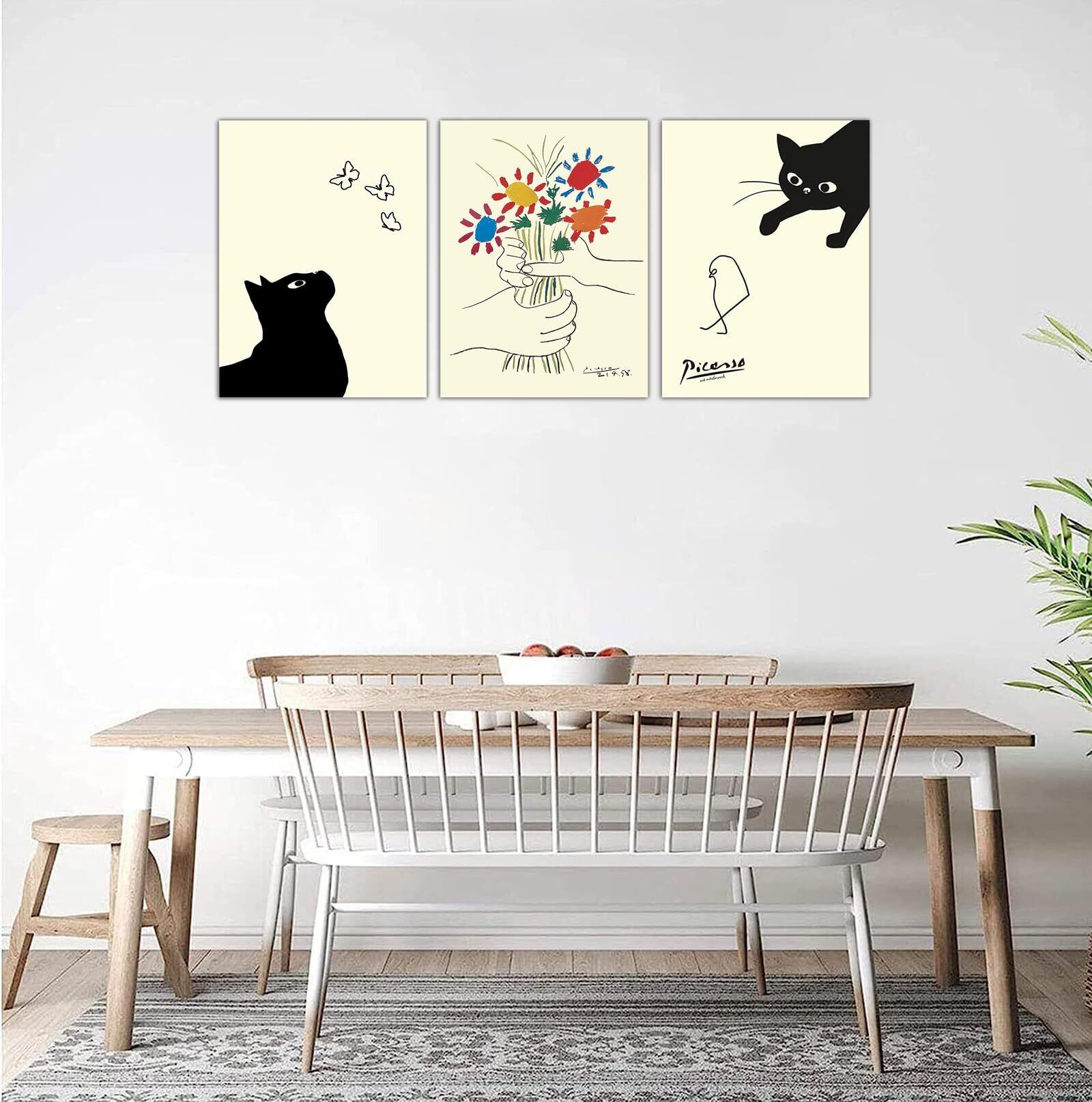 【在庫処分】ピカソ猫の絵 猫と友情の花 3枚 パネル アートポスター 装飾絵画 リビングルーム ソファ背景 壁装飾絵画 木枠付き完成 (30X40cmX3pcs, ピカソのポスター)