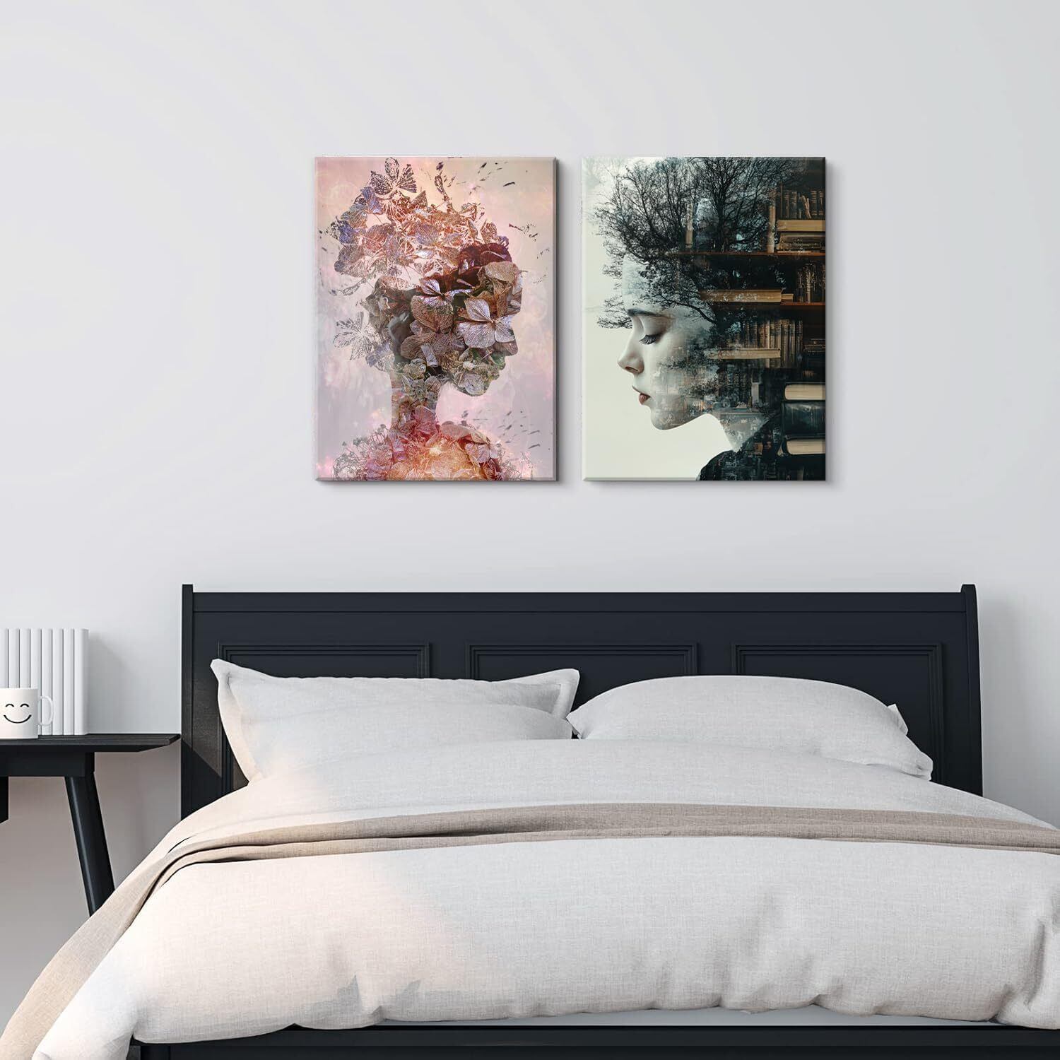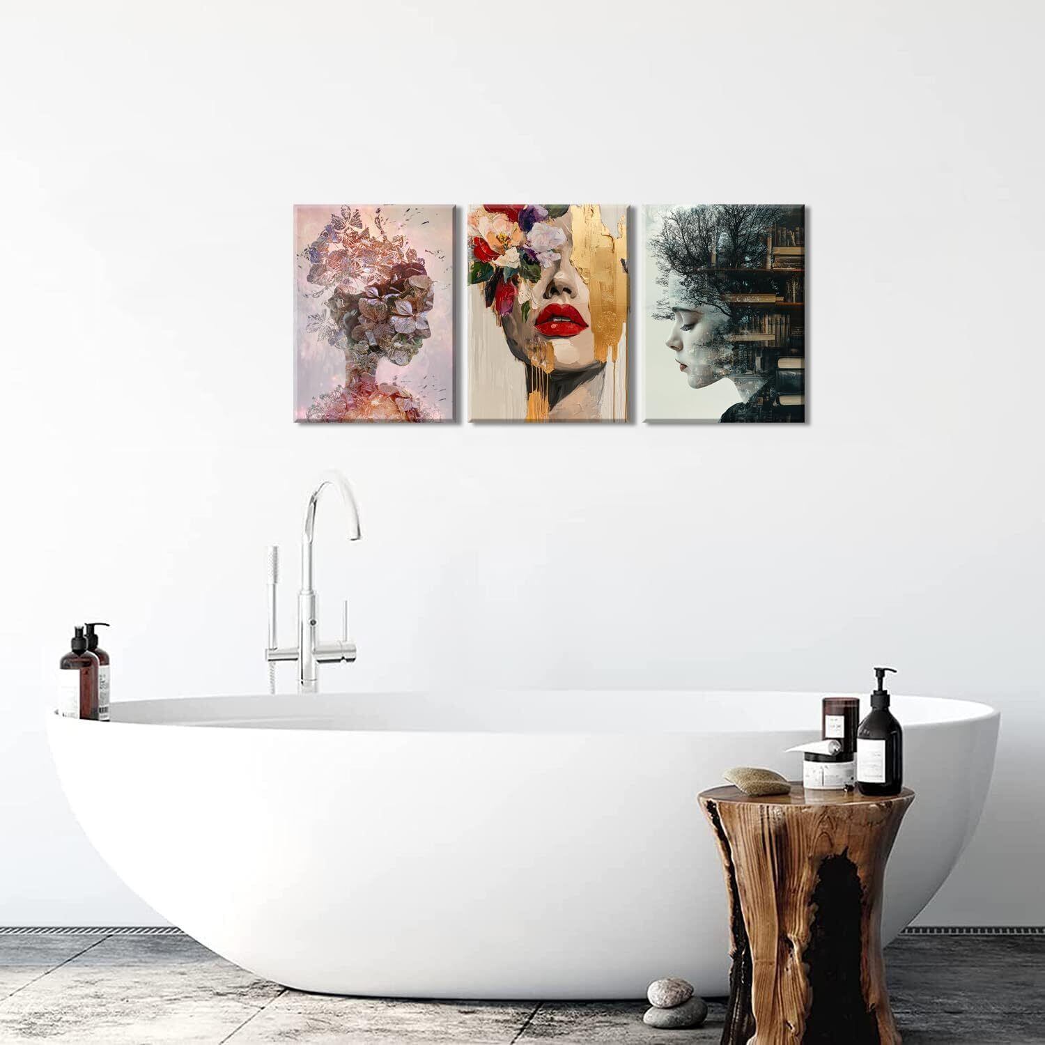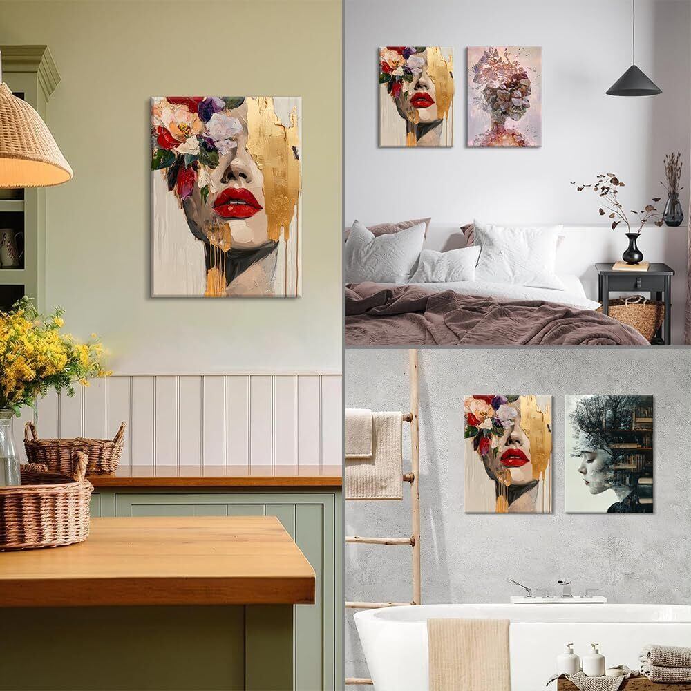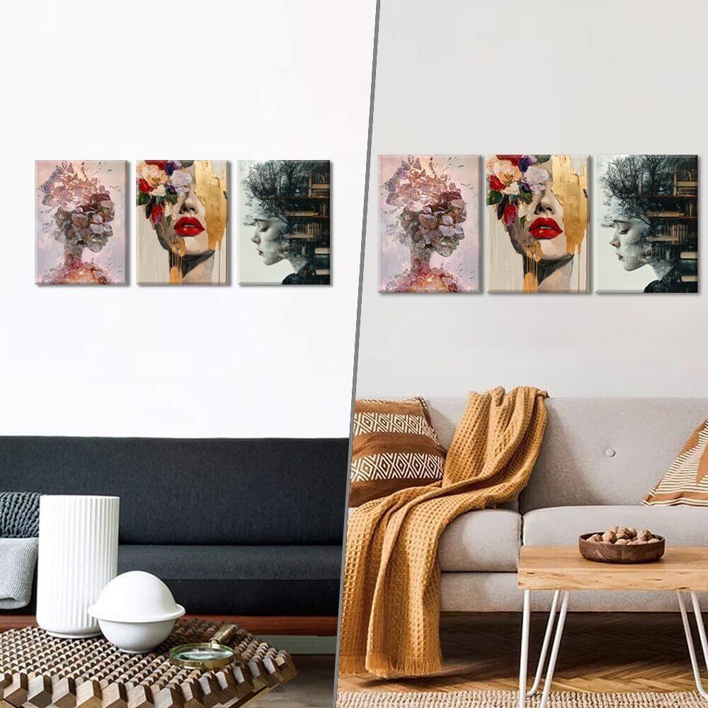 【絵画の主題】:この三枚の図のテーマカテゴリーは「女性と自然、芸術の融合」である。第一の図は女性の横顔を描き、その髪は木々と本で構成され、知識と自然の結合を象徴している。第二の図では、花と自然の要素で構成された女性像が、人と自然の調和と統一を表現している。第三の図は鮮やかな色彩と金色の装飾要素で女性の顔を描き、現代美術の美しさと神秘性を伝えている。全体を通して創造性と芸術性に満ちたスタイルで、様々な自然と芸術の要素を通じて、女性像の多様性と深遠な内面性を表現している。