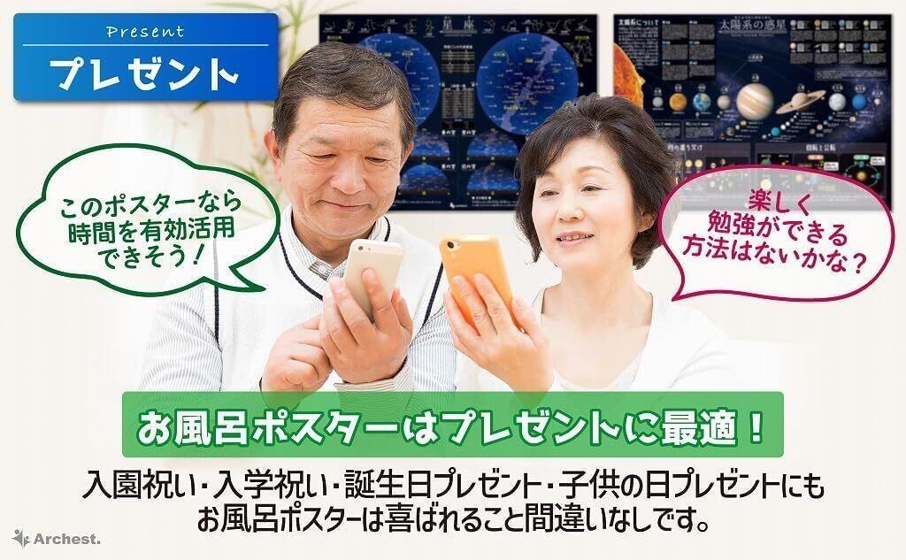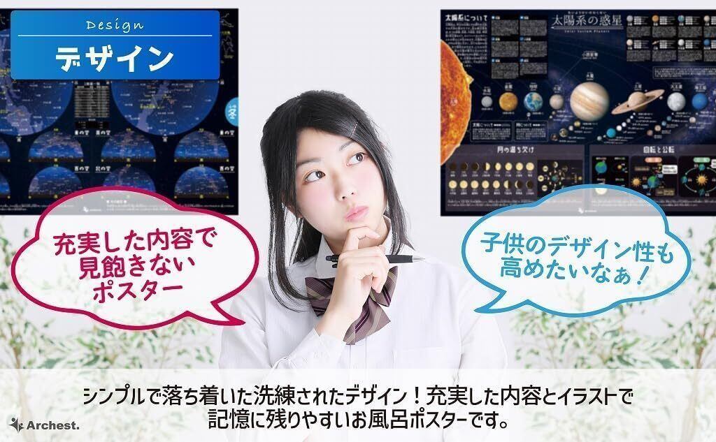 お風呂のリラックスタイムにおすすめ!見ているうちに自然と覚える“ながら学習”にちょうどいいお風呂ポスターです。お風呂ポスターを見ながら、星の名前をクイズ形式で当てたり、惑星の順番を声に出して覚えたりすることで、楽しみながら学習効果が高まります。