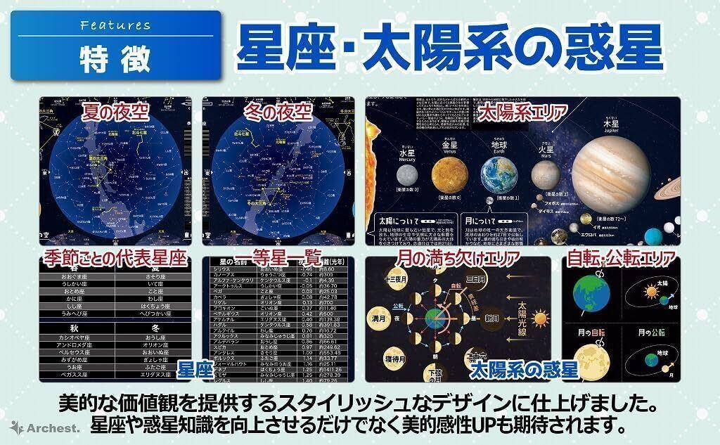 季節の星座や太陽系の惑星を「見る」「読む」「暗唱する」といった多様な感覚を使って学ぶことで(視覚・聴覚・言語)、記憶の定着と理解が深まります。さらに、夜空を実際に見ながら星座を探したり、月の満ち欠けを観察したりと、お風呂ポスターと実体験(天体観測や自由研究)を組み合わせることで、学びがより立体的になります。