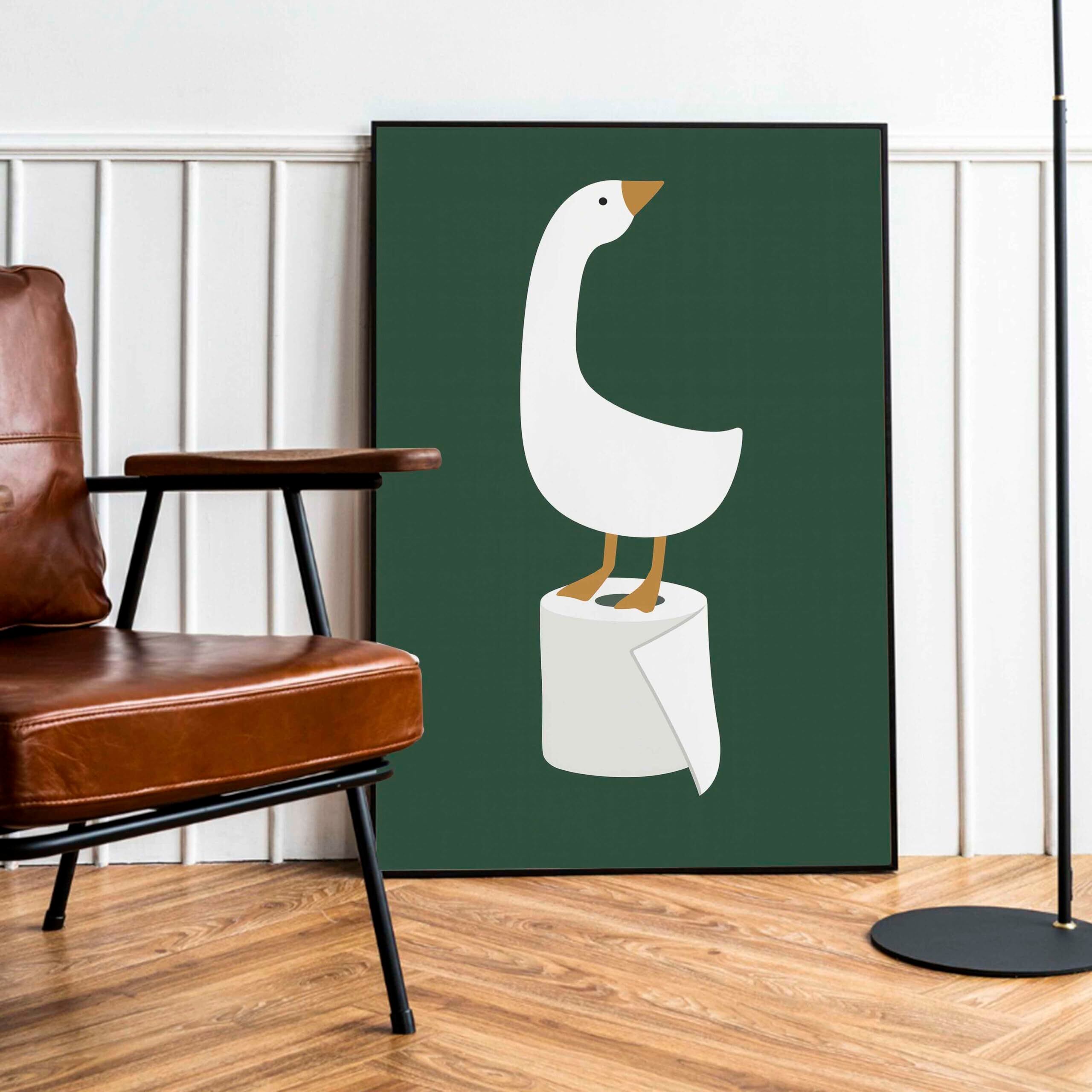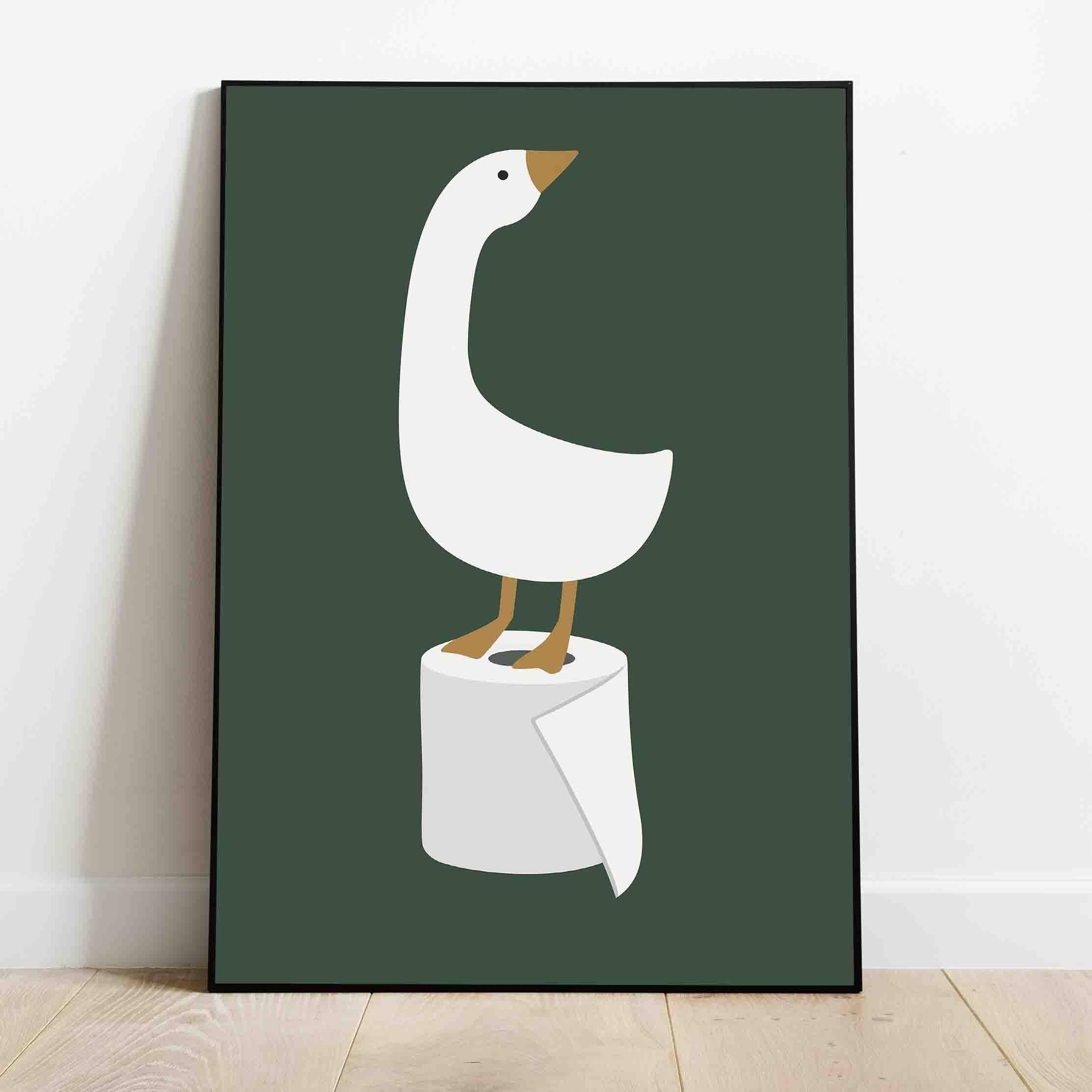 シンプルでミニマルなデザインの中に、思わずクスッと笑ってしまうユーモアを込めた一枚です。 白いガチョウが堂々とトイレットペーパーの上に立っている姿は、ユニークさと可愛らしさを兼ね備えており、お部屋のインテリアに遊び心をプラスしてくれます。 ・デザイン特徴 落ち着いたダークグリーン背景 シンプルで洗練された北欧風イラスト ガチョウ × トイレットペーパーというユーモラスなモチーフ ・おすすめの用途 トイレや洗面所に飾ってゲストを笑顔に リビングや寝室のアクセントに ギフトとしてもおすすめ お部屋の雰囲気をちょっと楽しく、ちょっとおしゃれに変えてくれるポスターです。 トイレや 子供部屋に最適
