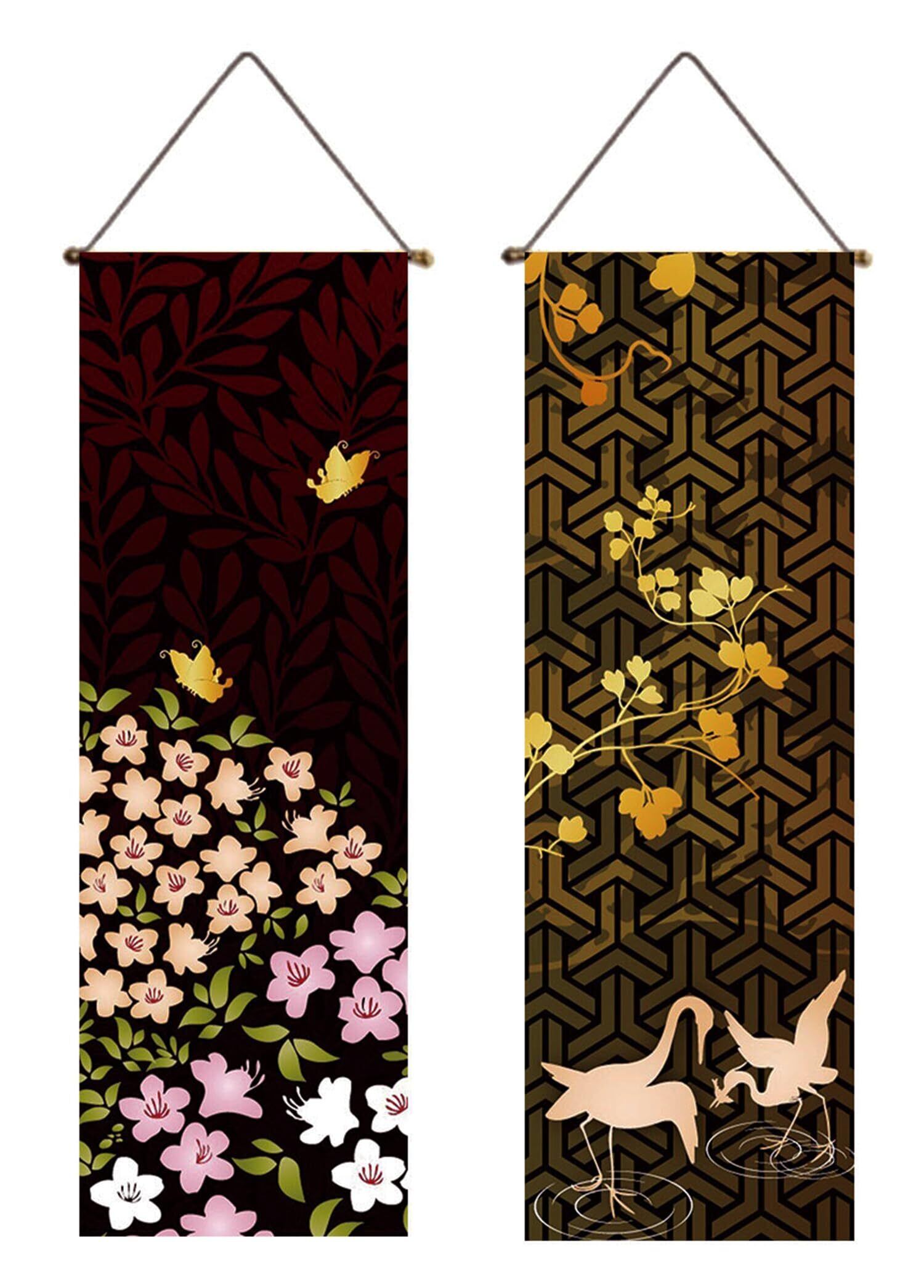 異なった和柄デザインの掛け軸ダイプのタペストリーがセットとなっており、すぐに飾っていただけます。 背景は黒を貴重とし、日本の植物・鳥を使いシックなデザインとなっております。