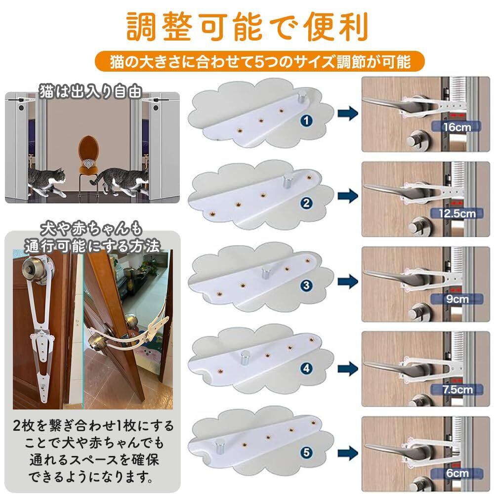 猫が自由に出入りできる快適な空間をつくる! ドアのハンドルに引っ掛けてピンを差し込むだけで、ドアに安全な隙間を確保できます。 ペットが挟まれる心配を防ぎ、空気の流れもよくなる優れもの。 5段階調整可能。2枚重ねることでさらに赤ちゃんや犬のためにスペースを広げることも可能! 軽量で丈夫。取り付けは工具不要です。