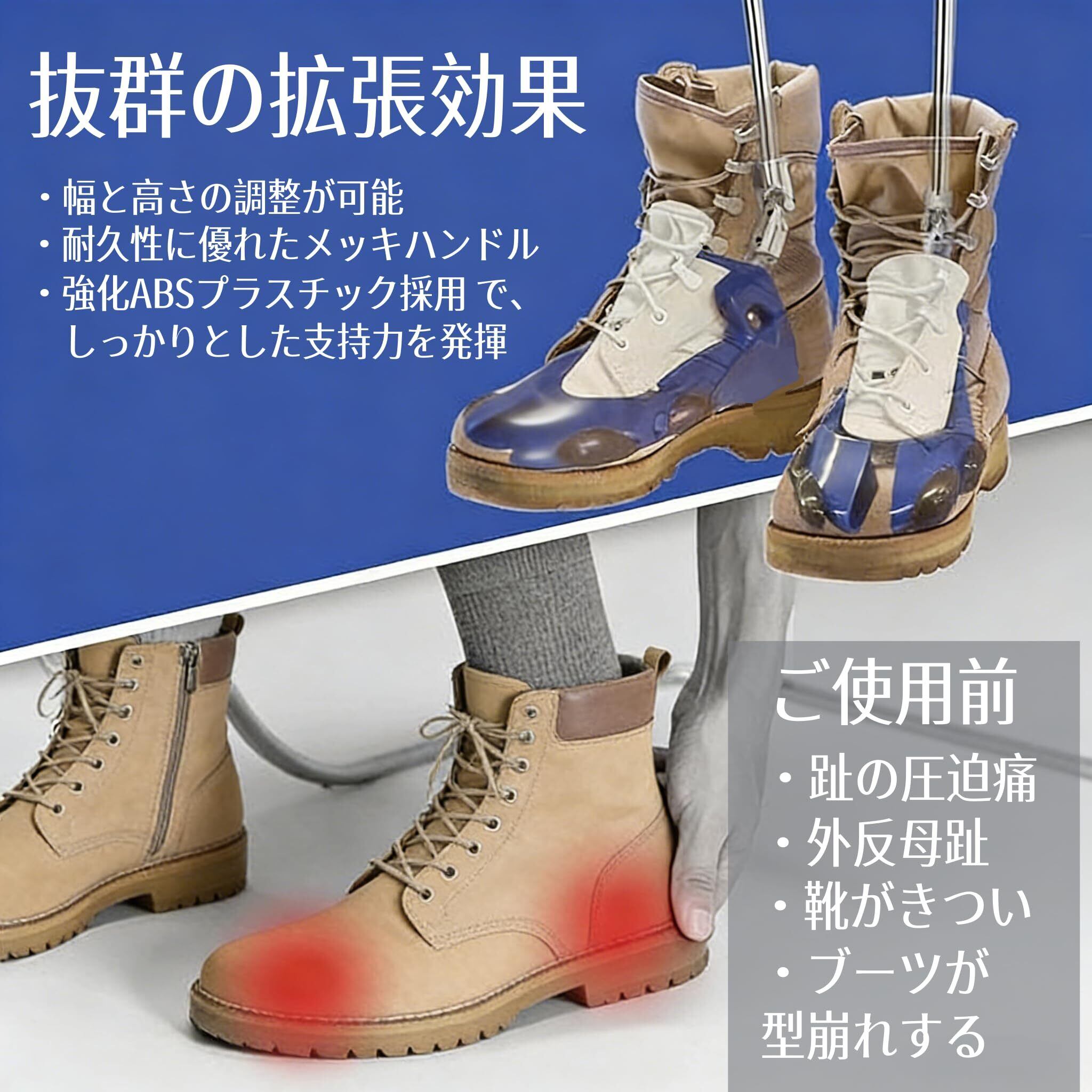 【きつい靴&痛い靴の悩みを解消】かかとが擦れて痛い、つま先が圧迫される、外反母趾で歩くのが辛い…そんな「きついブーツ」と「痛いブーツ」の悩みを抱えている方に、このブーツストレッチャーは最適です。お気に入りのブーツを無理なく調整し、あなたの足形にぴったりとフィットする快適なサイズに整え、悩みを根本から解消します。