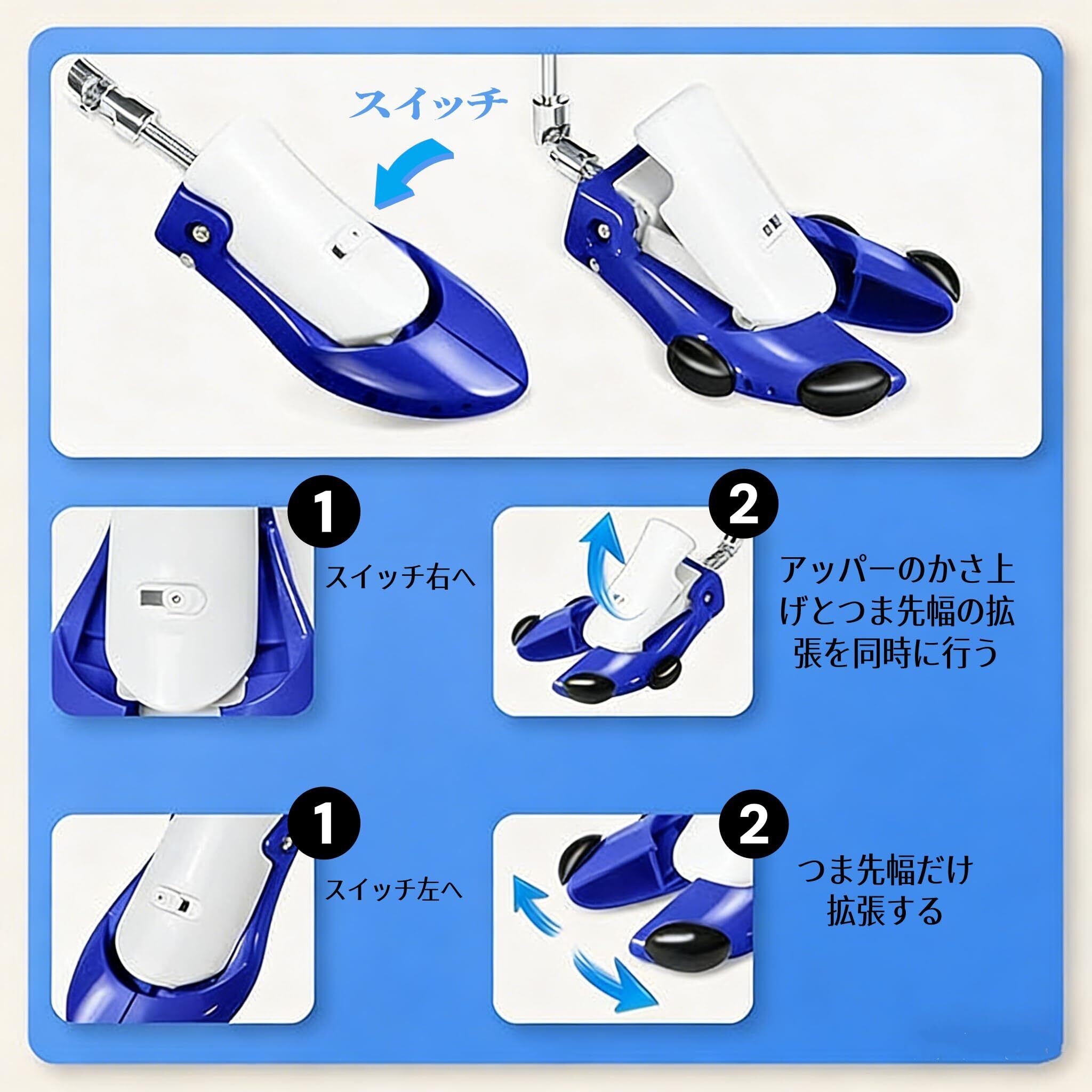 【専門的なスイッチ設計】このブーツすとれっちゃーは最新のスイッチのデザインは、このスイッチを切り替えて幅だけを広げたりアッパーをかさ上げ+つま先の幅を広げたりすることができ、あなたのニーズを満たすためにスイッチを調整することができます。靴のアッパーを最大高さ3.5センチ上げ出来ます。ブーツストレッチャー 甲高はあなたのお気に入りの新しいブーツをより快適に足にフィットさせることができます。