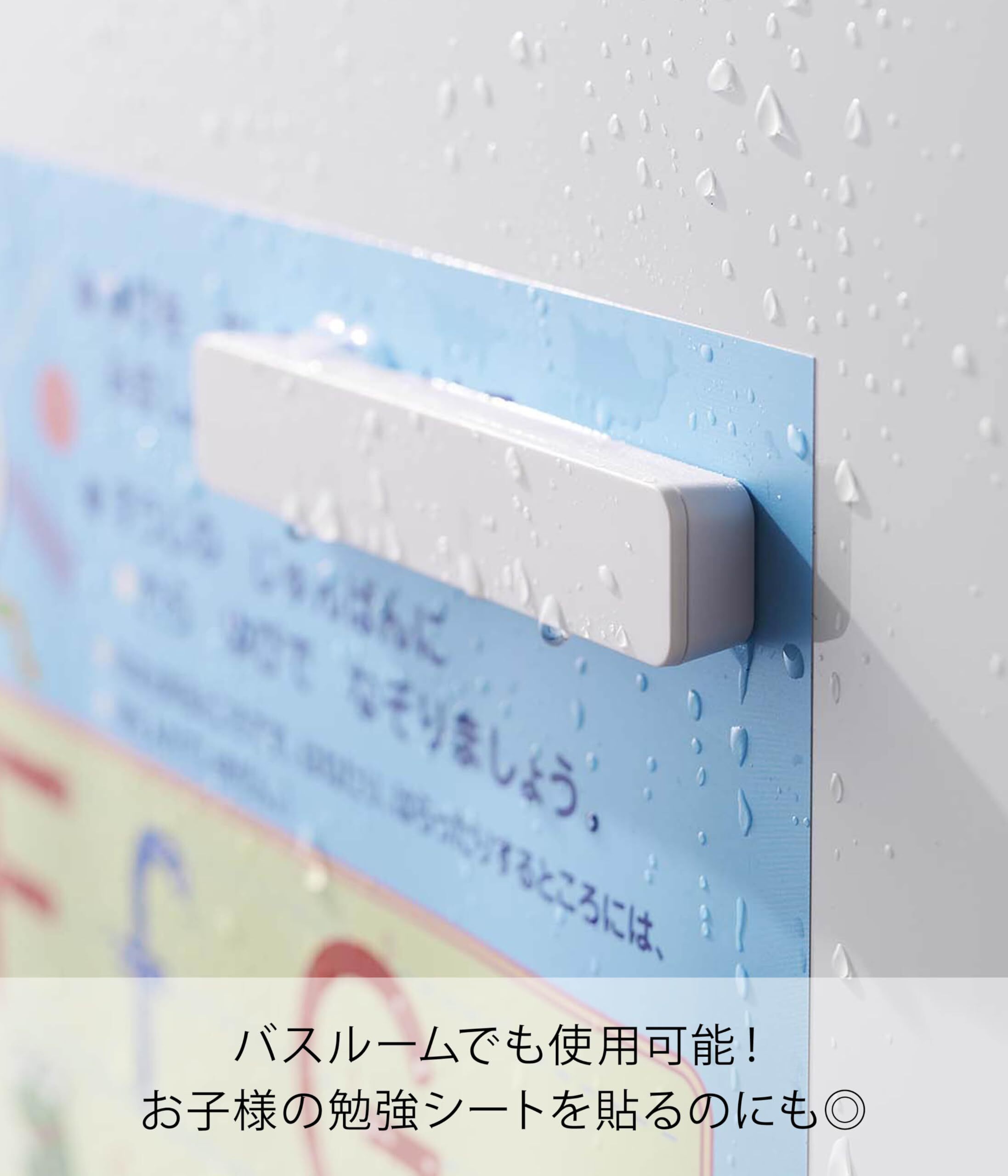 バスルームで子供のお勉強シートを貼るのにも使えます。