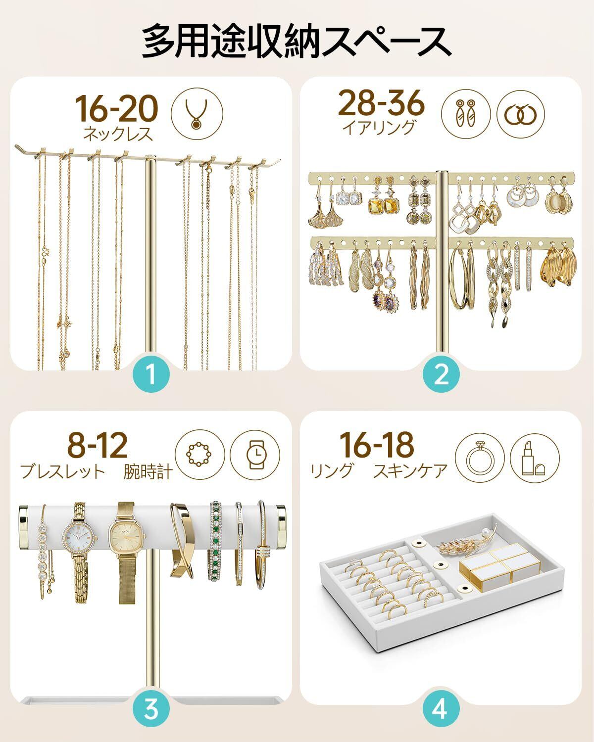 【全種類のアクセサリーをすっきり整理】このアクセサリースタンドは、ピアス、ネックレス、ブレスレットなど、さまざまなジュエリーをまとめて収納できる便利なアイテムです。3段式のデザインで、ネックレス16~20本、イヤリング28~36個、ブレスレット8~12個をすっきり収納可能。さらに、PUレザー製のトレイにはリング16~18個や小物も収納できます。